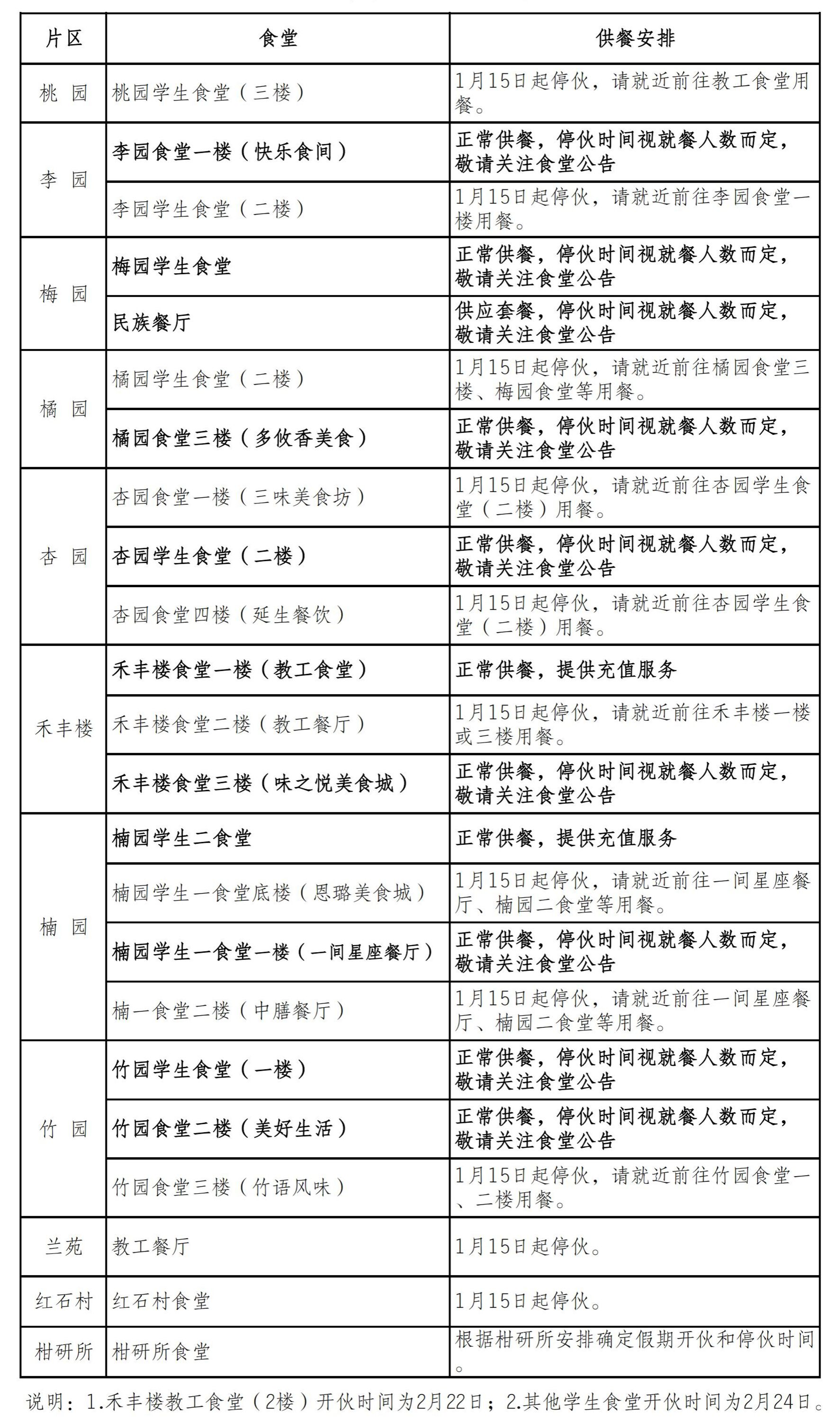 3.橘园、楠园快递服务站寒假期间正常服务,服务时间每天9:00-18:00;梅园、竹园快递服务站1月17日(星期三)起停止接收新到包裹,1月21日(星期日)起关停,2月21日(星期三)起恢复正常服务。