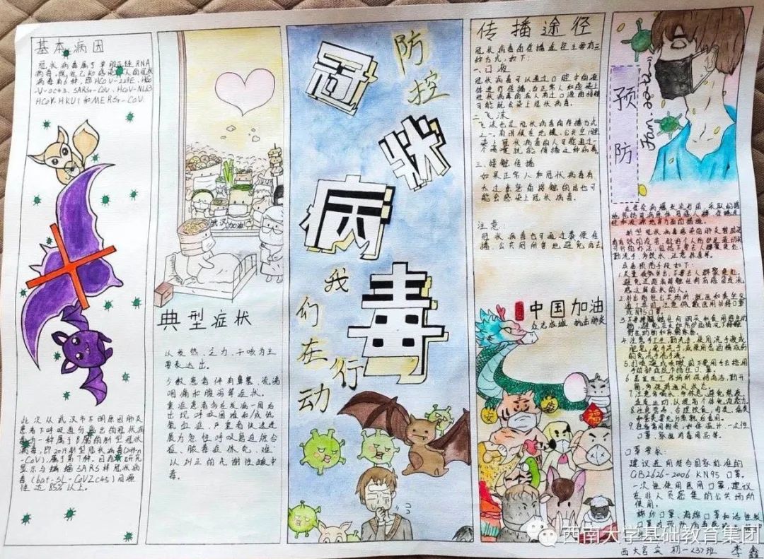 ●作品介绍:作者的美术刻画能力还不错,左下侧的中国地图画的比较准确,同时说明作者比较关注疫情防控的消息。作者从肺炎的起点(有待确定)—临床表现—预防措施,以及如何佩戴口罩等因素都阐述的很清楚。另外,”特殊碰肘礼“补充了防护措施,十分全面。
