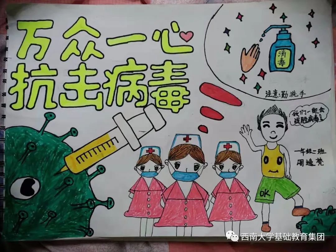 ●作品介绍:细心的朋友会发现,李同学的这幅作品是用手绘和拼贴的技法来呈现的,增强了单一媒介不能获得的对比与鲜艳程度,画面形式感特别强烈。作品同样写出了防疫口诀及防控疫情的方法。