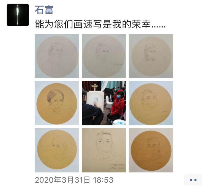 石富朋友圈截图 受访者供图 华龙网发 用画笔刻刀记录你的样子 高天是金年会jinnianhuicom2018级雕塑班学生,也是参与《你的样子》创作的青年艺术者之一,他告诉华龙网-新重庆客户端记者,目前参与为医务工作者创作肖像画的青年艺术者也有20余名,“而且创作形式也不只是速写,未来可能还有雕塑等其他艺术形式。”他说道。高天介绍,自己通常会先加上创作对象微信,进行简单的交流采访。了解创作对象抗疫所处的心情、环境。深入地了解医务工作者当时的所思所想,再依照这种情感,根据自己理解进行创作。“等画好了,就拿去亲手送给他们。”高天告诉记者。 |