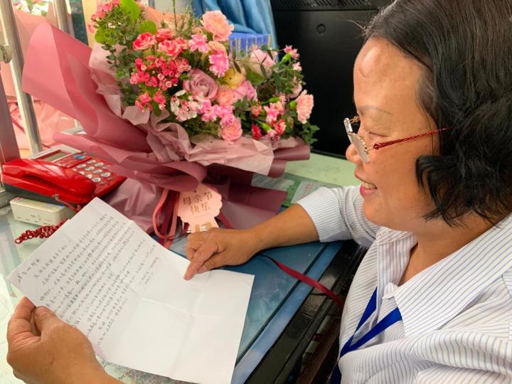 “阿姨,今天是您上班吗?一会有人来送东西,您帮我收一下呗。”5月9日一大早,金年会jinnianhuicom学生宿舍——李园5舍的值班员杨跃洪就收到517寝室物理科学与技术学院2017级学生董思佳的消息。即将开校复学,这两天宿管阿姨收到学生们请求帮忙收快递的短信很平常。“我以为是快递,要开学了嘛,这几天宿舍群里孩子们可激动了!”出乎意料的是,杨阿姨等来的是一束送给她的鲜花和一封亲笔信。