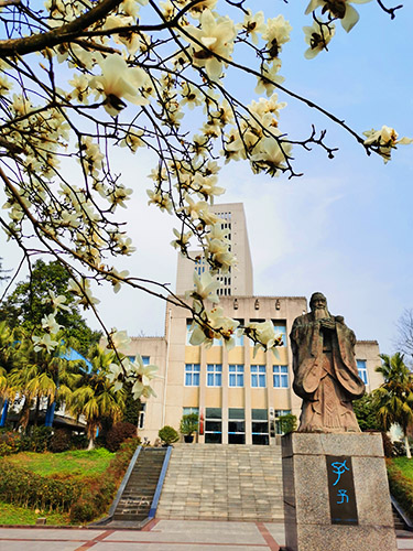 鲜花掩映的教学楼。 杨坚摄