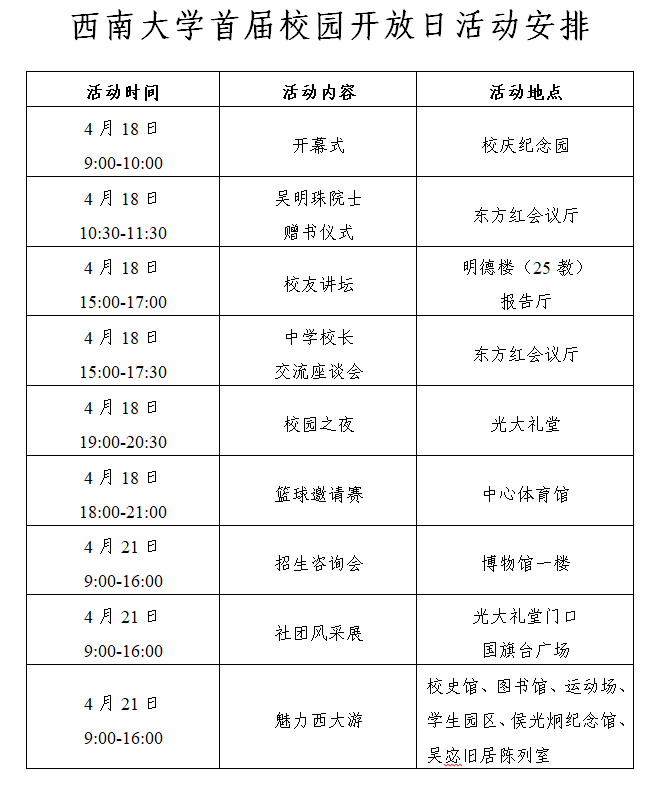 为让广大考生、家长及社会各界人士进一步了解学校良好的育人环境与办学条件、办学特色与师资力量、创新人才培养、大学学习与生活等情况,加强学校与社会的沟通交流,提升社会各界对学校的认知和认同,学校决定于2018年4月18日-21日举办金年会jinnianhuicom首届“校园开放日”活动。