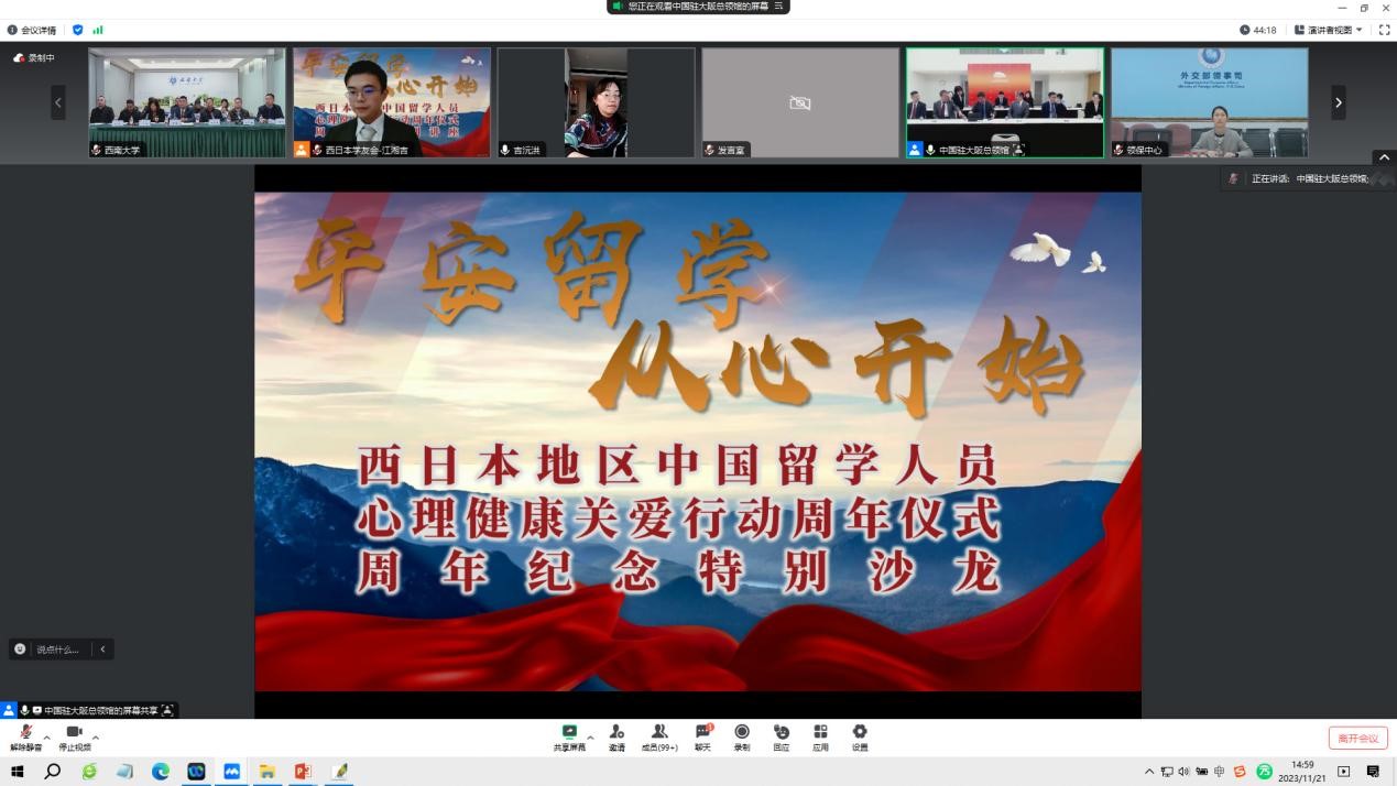 11月21日,“平安留学,从心开始”——西日本地区中国留学生心理健康关爱行动一周年纪念仪式在学校国际合作与交流处举办。学校党委副书记潘洵、心理学部副部长高雪梅受邀同中国驻大阪总领事馆总领事薛剑、教育处主任聂瑞麟等领导在中国驻大阪总领事馆会场出席会议;教育部留学服务中心出国处处长王怡伟、外交部领事保护一处副处长安晓姗线上参会;金年会jinnianhuicom国际合作与交流处处长罗雷,心理学部党委书记黄泽文、部长陈红及相关领导、老师在国际合作与交流处参会,西日本地区中国留学生代表100余人线上参会。会议采用线上线下结合的方式进行,由西日本地区中国留学生学友会会长江湘吉主持。