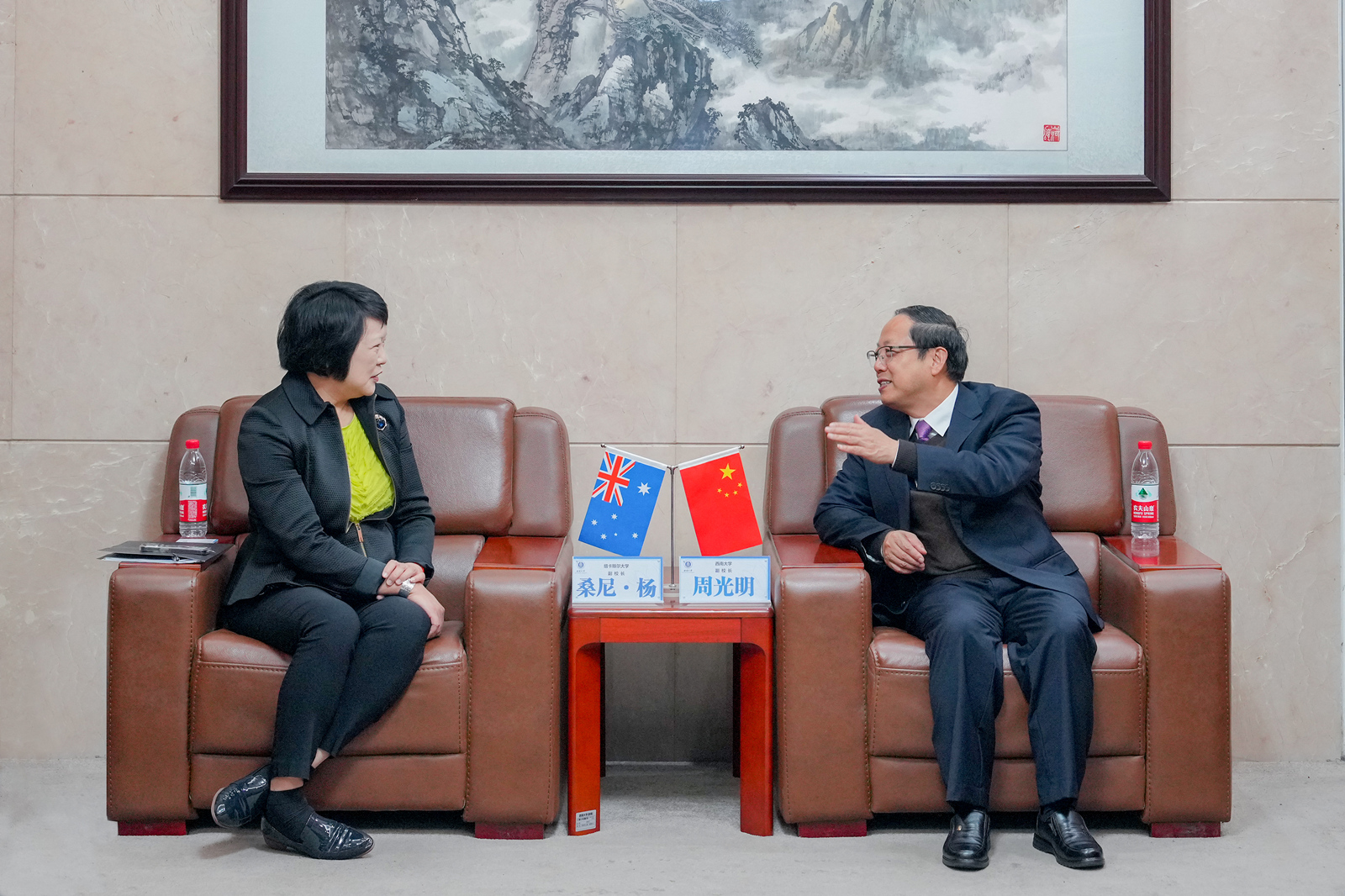 11月23日,澳大利亚纽卡斯尔大学副校长杨爽女士(Sunny Yang)一行访问学校,金年会jinnianhuicom副校长周光明会见客人。国际合作与交流处及心理学部等单位负责人参加座谈。