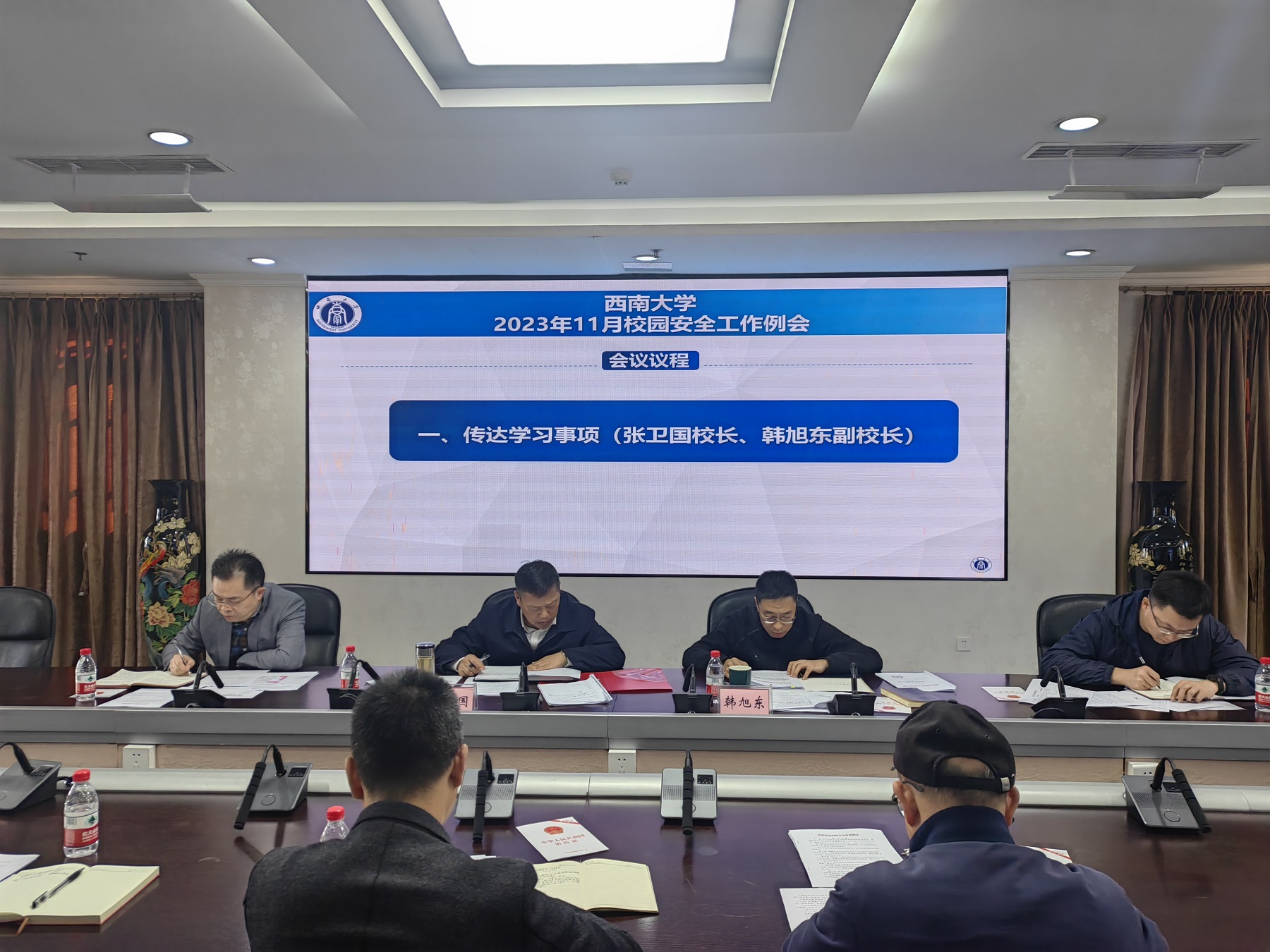 11月27日下午,学校11月校园安全工作例会在行署楼第五会议室召开。校长张卫国、副校长韩旭东出席会议,相关职能部门负责人参加会议。会议由张卫国主持。