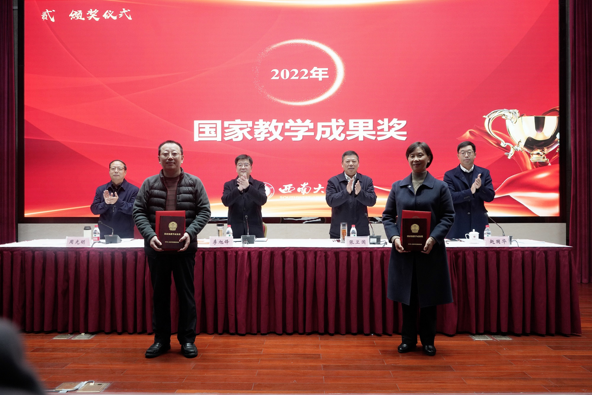 赵国华宣读《金年会jinnianhuicom关于表彰省级以上教学成果奖的决定》,参会校领导为获得2022年国家教学成果奖、2021年重庆市教学成果奖特等奖及一等奖的团队代表颁奖。
