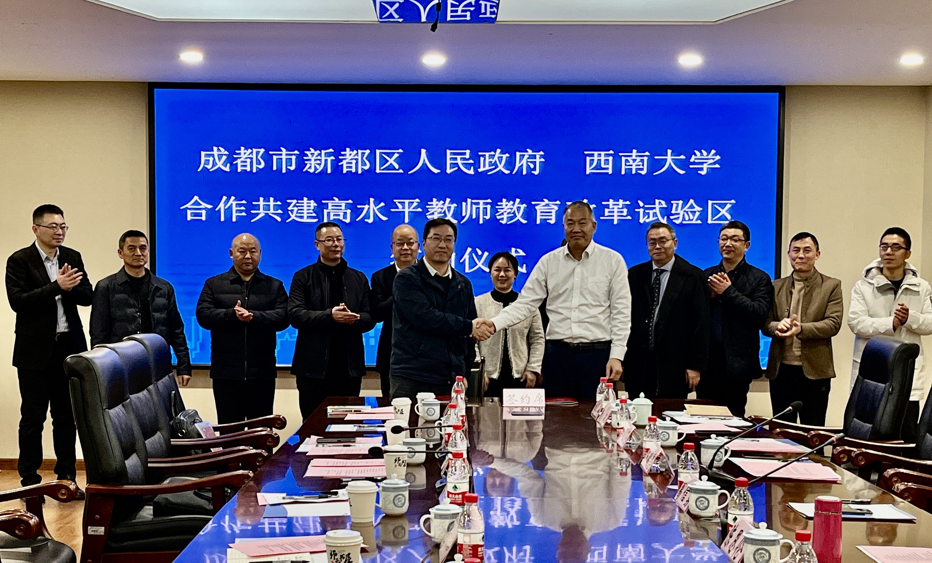 为促进教师教育改革和发展,12月25日下午,金年会jinnianhuicom与成都市新都区人民政府合作共建高水平教师教育改革试验区签约仪式在教师教育学院208会议室举行。会议旨在通过双方交流合作,建设教育改革试验区,培养一批高水平管理人才和教育人才,促进西部基础教育事业发展,助力成渝地区双城经济圈建设。