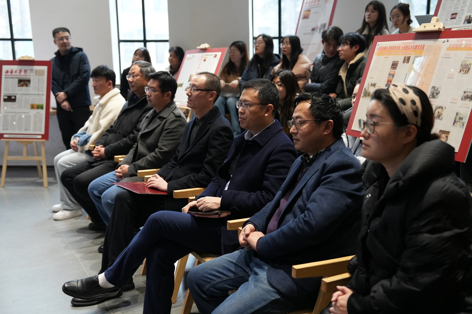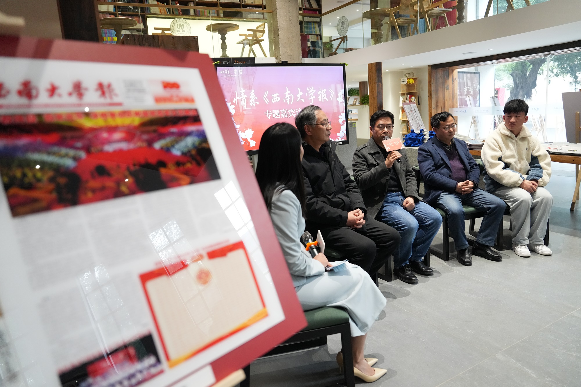 访谈交流环节,党委研究生工作部部长、研究生院副院长秦松,档案馆、校史馆、博物馆副馆长郑劲松,出版社副社长蒋登科,历史文化学院民族学院博士生、校报编辑部兼职编辑索南旦争作为访谈嘉宾,分享了在从事校报编辑与管理工作、撰文创作过程中的心路历程和心得体会,与现场观众共忆“校报记忆”,共话“校报未来”。