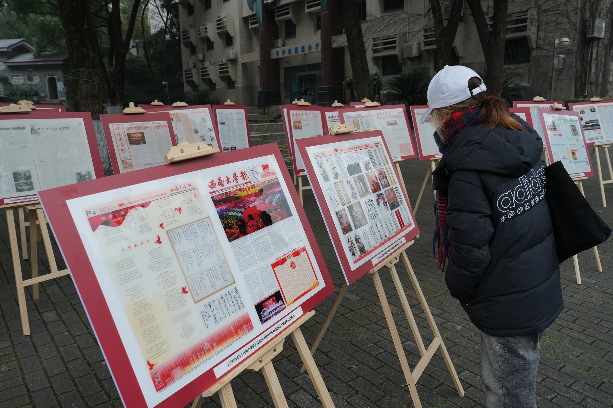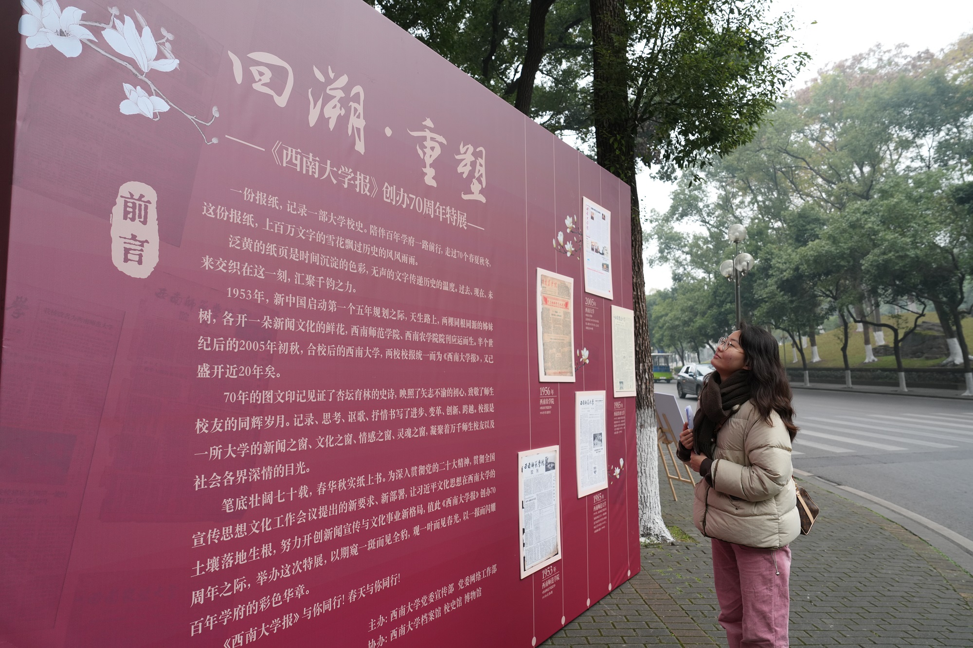 在学校北区樟树林广场,由党委宣传部、党委网络工作部主办,档案馆、校史馆、博物馆协办的“回溯·重塑”《金年会jinnianhuicom报》创办70周年特展也同步与师生见面。“历史沿革”展区图文并茂地展示了校报的“前世今生”,记录了校报与学校共同成长发展的历史轨迹。在“过刊集萃”展区,错落的展架上摆放着不同时期的重要报道和重要期刊,生动展现了校报对学校历史的忠实记录和对学校发展的忠诚守护。过往师生纷纷驻足观看,拍照留念。