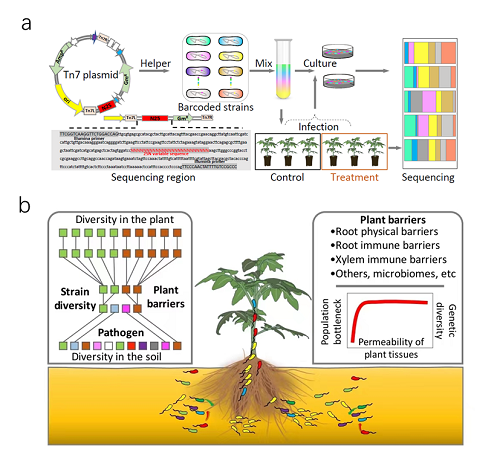 “根—土交界面”——根际抵御土传致病菌进入植物体内的天然屏障。根际微生物、根层细胞、免疫蛋白、拮抗物质等共同决定根际抵御土传病原菌入侵的能力,即根际免疫。然而,当前仍缺乏对根际免疫强度的有效评估方法,更缺乏对根际免疫与致病菌生态进化关系的深刻理解。为此,本研究以土传植物病原细菌青枯菌为研究对象,协同创新,建立了高通量基因组等位基因标记技术:在青枯菌染色体非编码区定向插入序列随机的DNA片段(Random Barcode DNA, 25-bp),人工构建了等位基因标记的青枯菌复合群体,通过扩增子测序检测Barcode的丰度变化,采样群体遗传学算法量化根际免疫,利用生态模型探究青枯菌的种群动态变化和生态进化。为评估根际免疫强度对致病菌生态进化的影响,本研究以抗性和易感两种番茄品种为材料,采用灌根接种、伤根接种和注射接种三种方式,模拟根际免疫强度的梯度变化,探究根际入侵前后,标记青枯菌种群结构、组成和多样性的变化规律。研究发现根际免疫强度的增加,选择压增强,导致成功入侵植物体内青枯菌的种类和多样性减少。其中,根系物理结构和免疫能力的完整性,是根际免疫制约青枯菌入侵过程和生态进化的关键。该研究揭示了根际免疫强度影响土传致病菌生态进化的过程与机制,为土传致病菌的生态阻控提供理论与技术支撑。