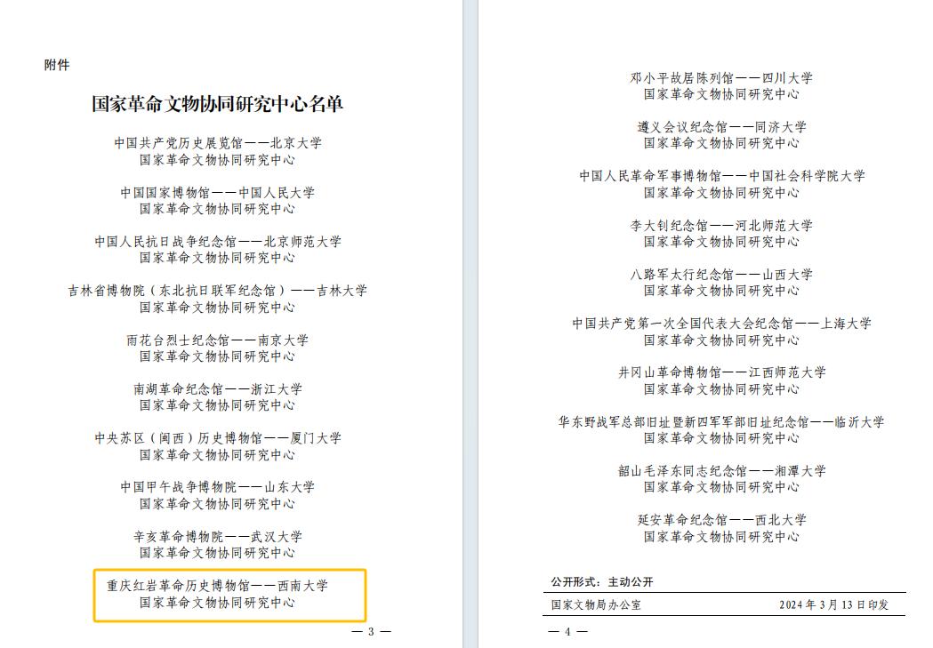 近日,教育部、国家文物局公布了国家革命文物协同研究中心名单,学校协同重庆红岩革命历史博物馆红岩博物馆创建的“重庆红岩革命历史博物馆——金年会jinnianhuicom国家革命文物协同研究中心”(以下简称“协同研究中心”)成功入选。协同研究中心是由教育部、国家文物局批准设立的国家级人文社科重点研究平台,按照教育部人文社会科学重点研究基地管理。这是继西南民族教育与心理研究中心之后,学校获批的第二个教育部人文社科重点研究基地。