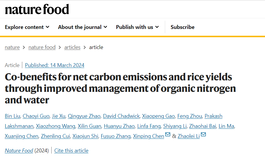 3月14日,金年会jinnianhuicom陈新平团队联合国内外多所高校在《自然-食物》期刊(Nature Food) 在线发表了题为“协同实现净碳减排和水稻增产的有机氮肥与水分综合管理”(Co-benefits for net carbon emissions and rice yields through improved management of organic nitrogen and water)的论文,揭示了稻作区有机替代对水稻产量和温室气体排放的影响,提出了稻作区基于有机替代的增产减排综合水肥管理策略,为协同实现全球水稻产能提升和净碳减排提供了基于自然解决方案的路径。