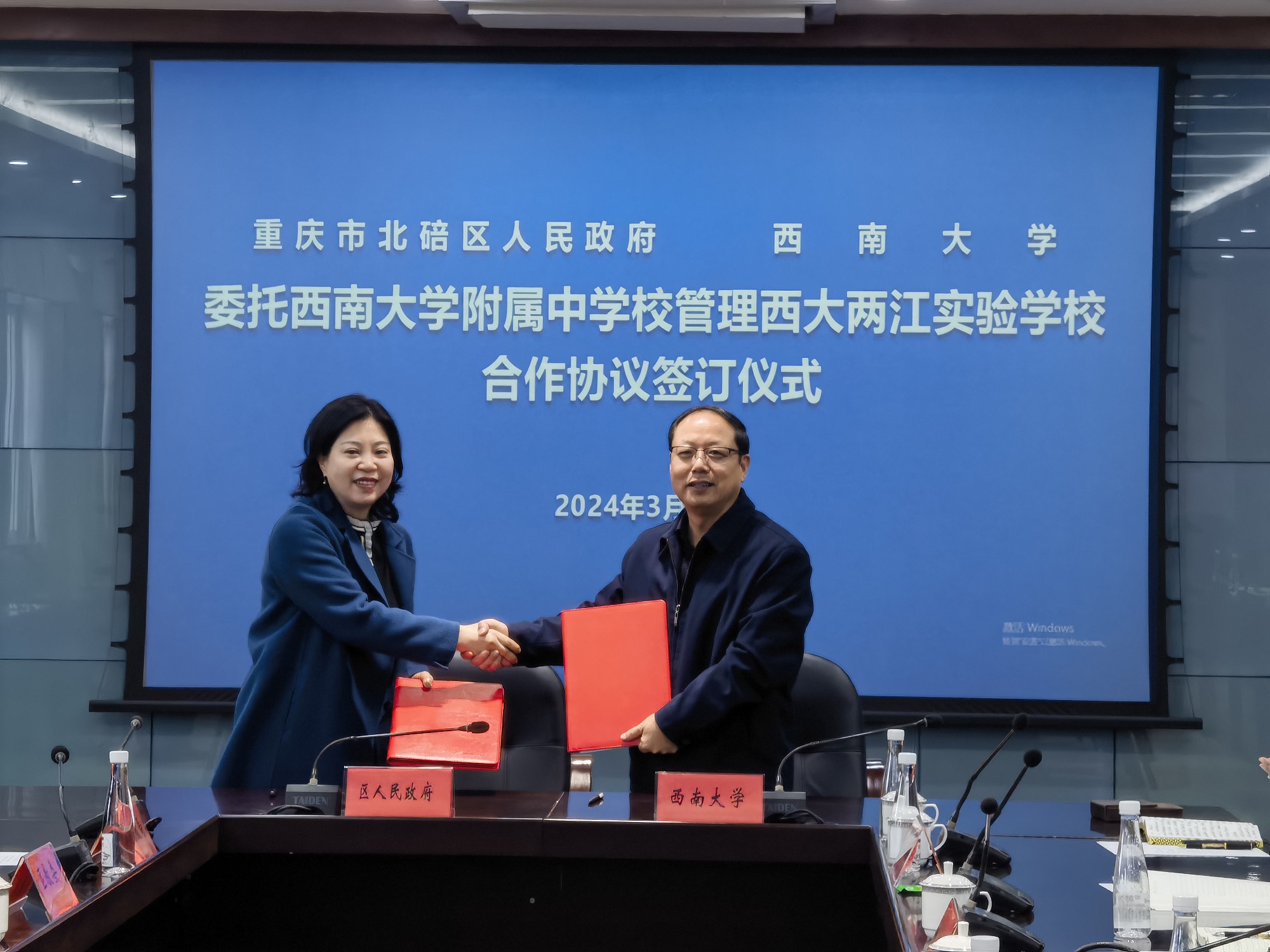 随后,双方在北碚区政府召开委托金年会jinnianhuicom附属中学校管理西大两江实验学校合作协议签约仪式。签约仪式上,双方介绍了合作及西大两江实验学校基本情况,并表示将大力支持学校优质快速发展。