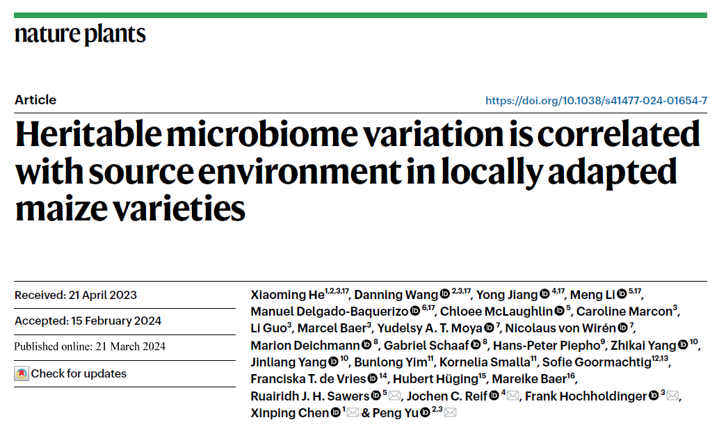 3月21日,金年会jinnianhuicom陈新平团队联合德国波恩大学等国内外多所高校在《自然-植物》(Nature Plants)期刊发表了题为“遗传性微生物组的变异与当地适应玉米品种的来源环境相关”(Heritable microbiome variation is correlated with source environment in locally adapted maize varieties)的论文,揭示了非生物胁迫下植物-微生物有益互作的遗传基础和环境调控机制。