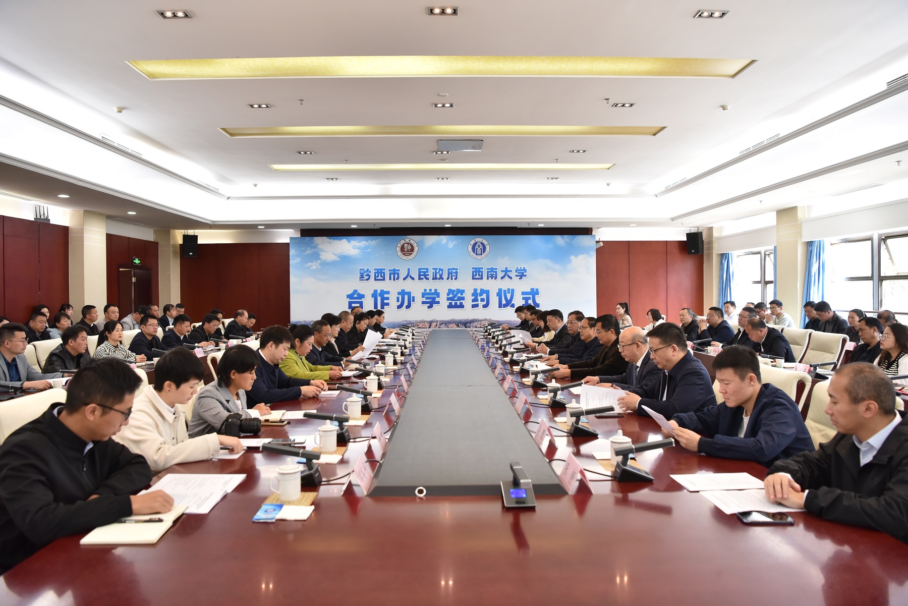 为认真贯彻落实国家《“十四五”县域普通高中发展提升行动计划》,推动民族地区基础教育优质均衡发展,3月25日,基础教育投资管理有限公司与贵州省黔西市人民政府合作共建“黔西市第一中学”签约仪式在贵州省黔西市行政中心会议室举行,全国人大常委、民建中央副主席、重庆市人大常委会副主任、民建重庆市委主委沈金强,民建中央常委、民建中央财经委员会主任、民建贵州省委主委李瑶,毕节市委常委、统战部长潘发勇,学校副校长周光明出席仪式。黔西市人大常委会主任蒙敏主持会议。