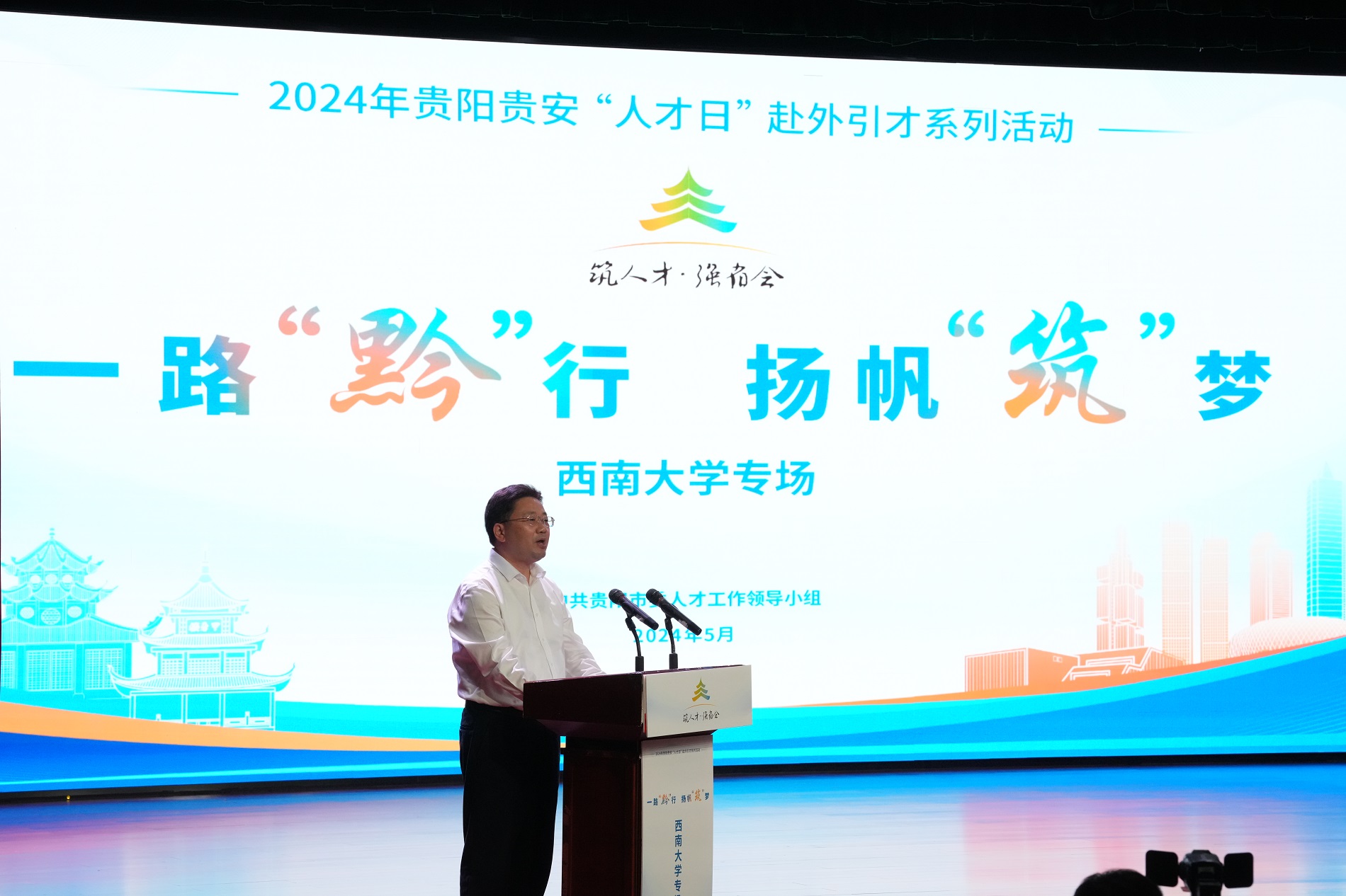 学校党委书记张卫国出席活动并致辞,贵州省委常委、贵阳市委书记、贵安新区党工委书记胡忠雄出席活动,贵阳市委常委、组织部部长龙章怀作人才招引推介,金年会jinnianhuicom在贵阳就业创业毕业生代表、贵州赛福建设工程有限公司董事长张昕和贵阳市第一中学团委副书记徐艺容发言。