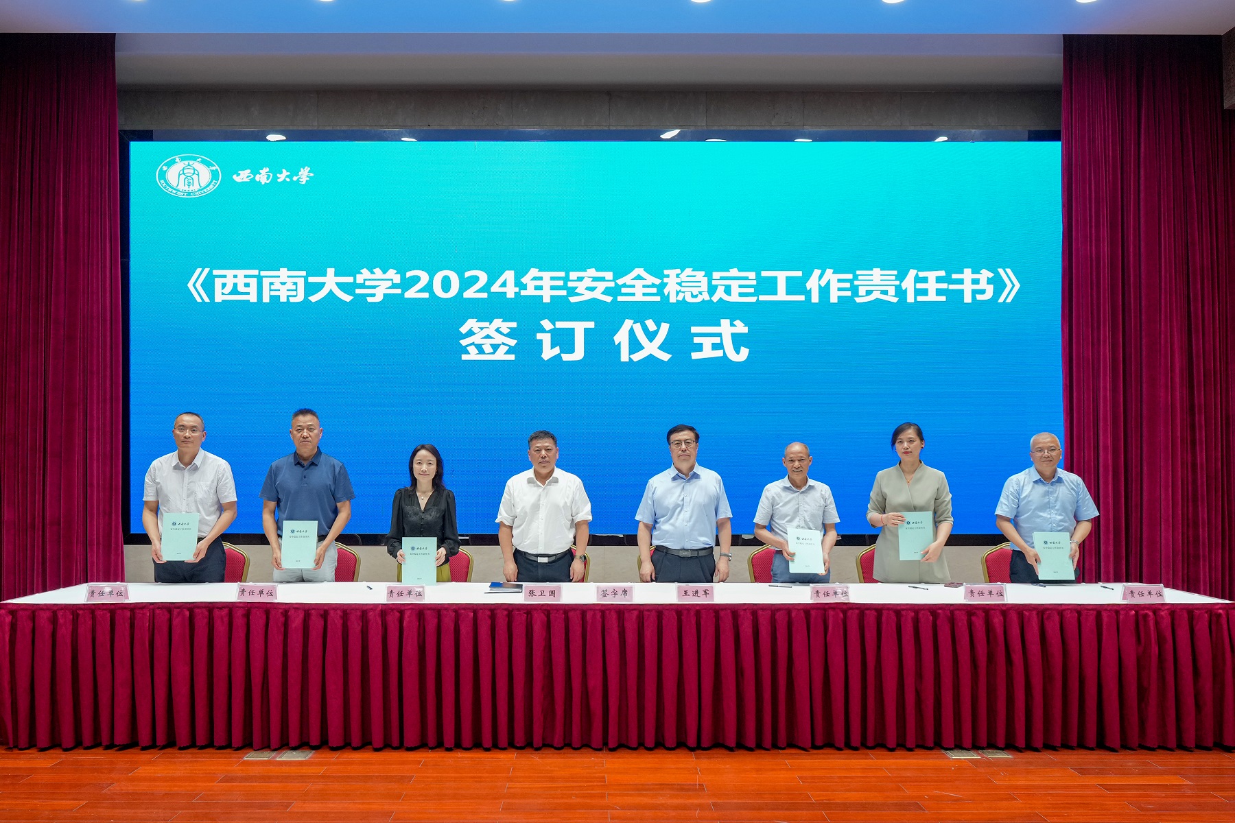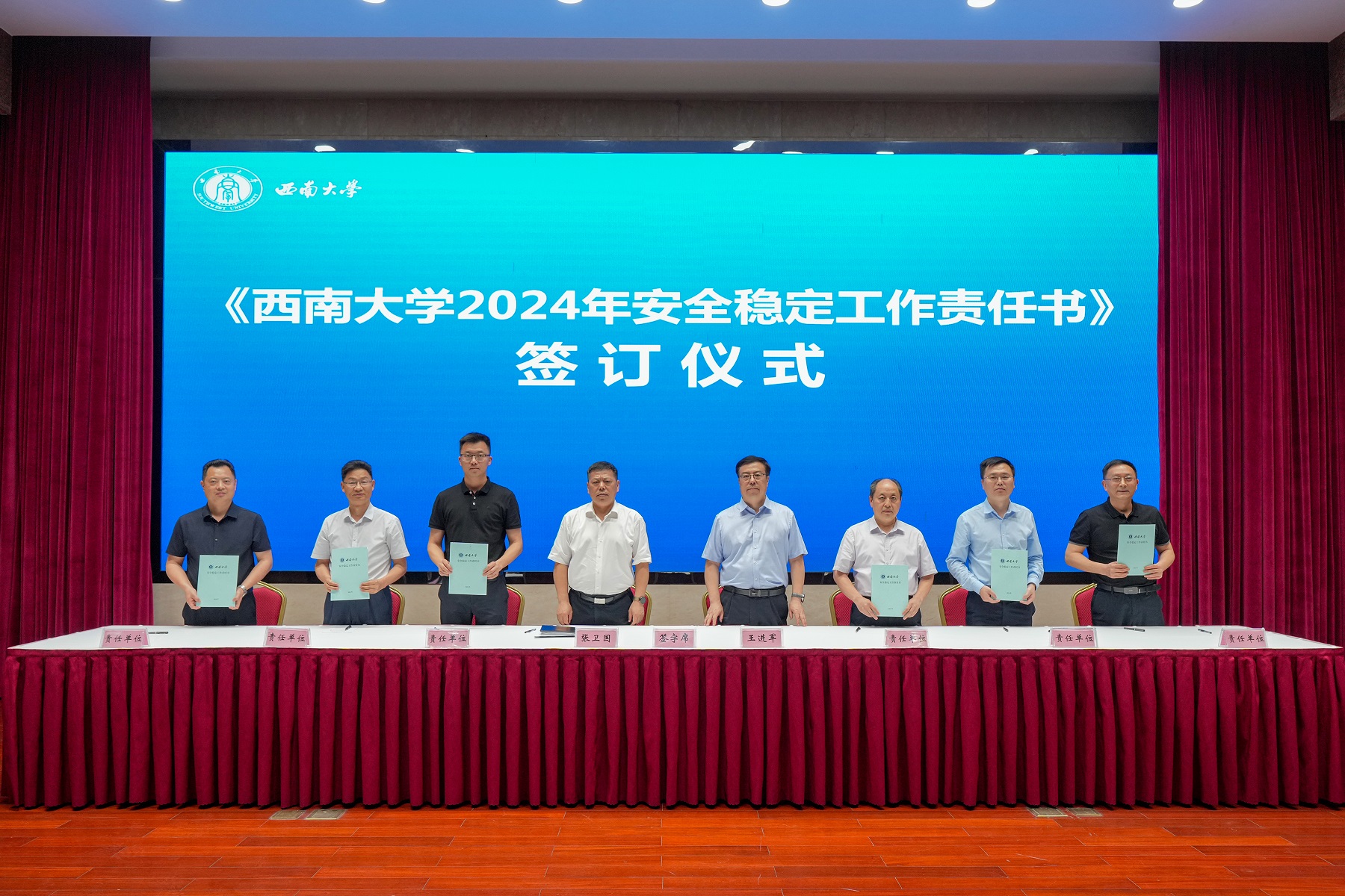 会议举行了2024年安全稳定工作责任书签订仪式,张卫国、王进军分别与教学单位、机关部门、直附属单位、企业单位主要负责人签订责任书。