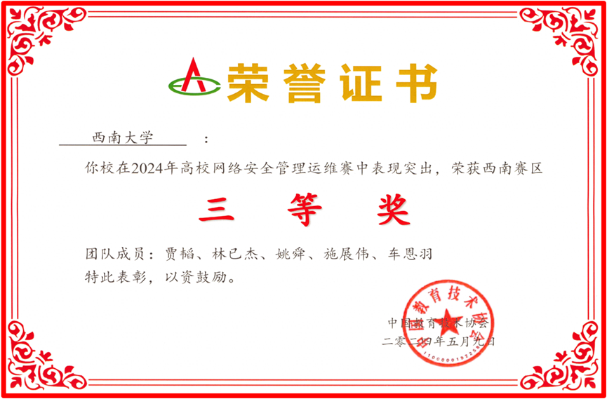 5月16日,教育部教育管理信息中心在福建厦门举办了全国高校网络安全管理运维赛颁奖典礼,由学校信息化建设办公室指导,3名本科生组成骨干的参赛队伍荣获西南赛区三等奖,在西南赛区59所参赛高校中排名第五,重庆高校中排名第一。