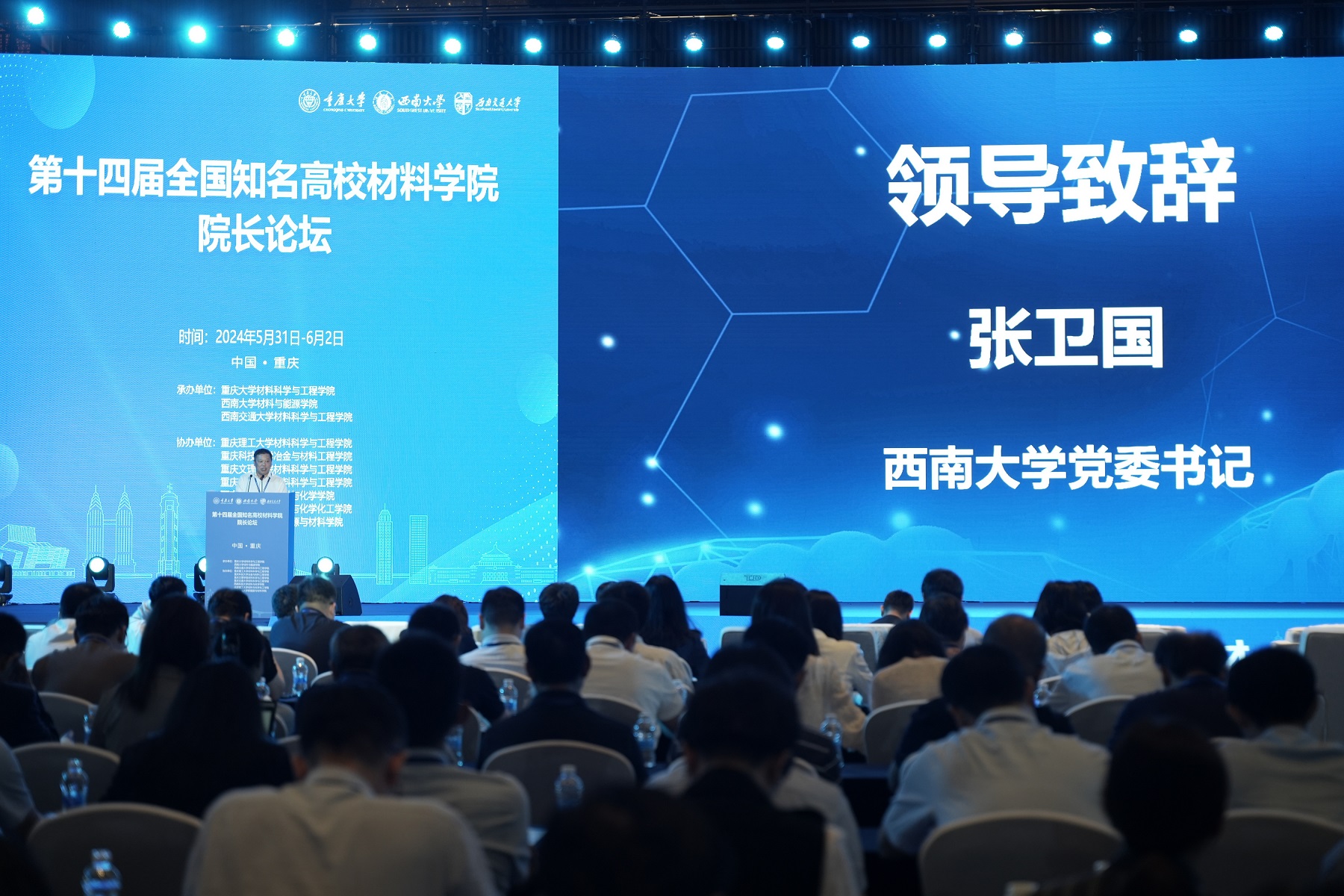5月31日至6月2日,第十四届全国知名高校材料学院院长论坛在重庆举行。论坛由重庆大学、金年会jinnianhuicom、西南交通大学联合主办,重庆大学材料科学与工程学院、金年会jinnianhuicom材料与能源学院、西南交通大学材料科学与工程学院共同承办,以“打造高水平创新平台,推动材料学科高质量发展”为主题,为推动全国高校材料学科发展与合作搭建了高端交流平台。6名中国科学院、中国工程院院士,20余位高校负责人及来自全国170余所高校的近700名专家学者参加论坛。学校党委书记张卫国,党委副书记、纪委书记夏玉峰出席论坛,张卫国在开幕式上致辞。