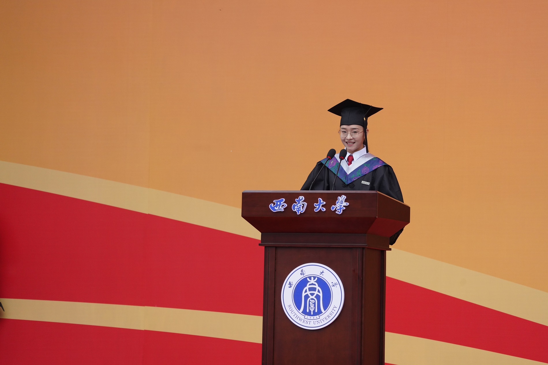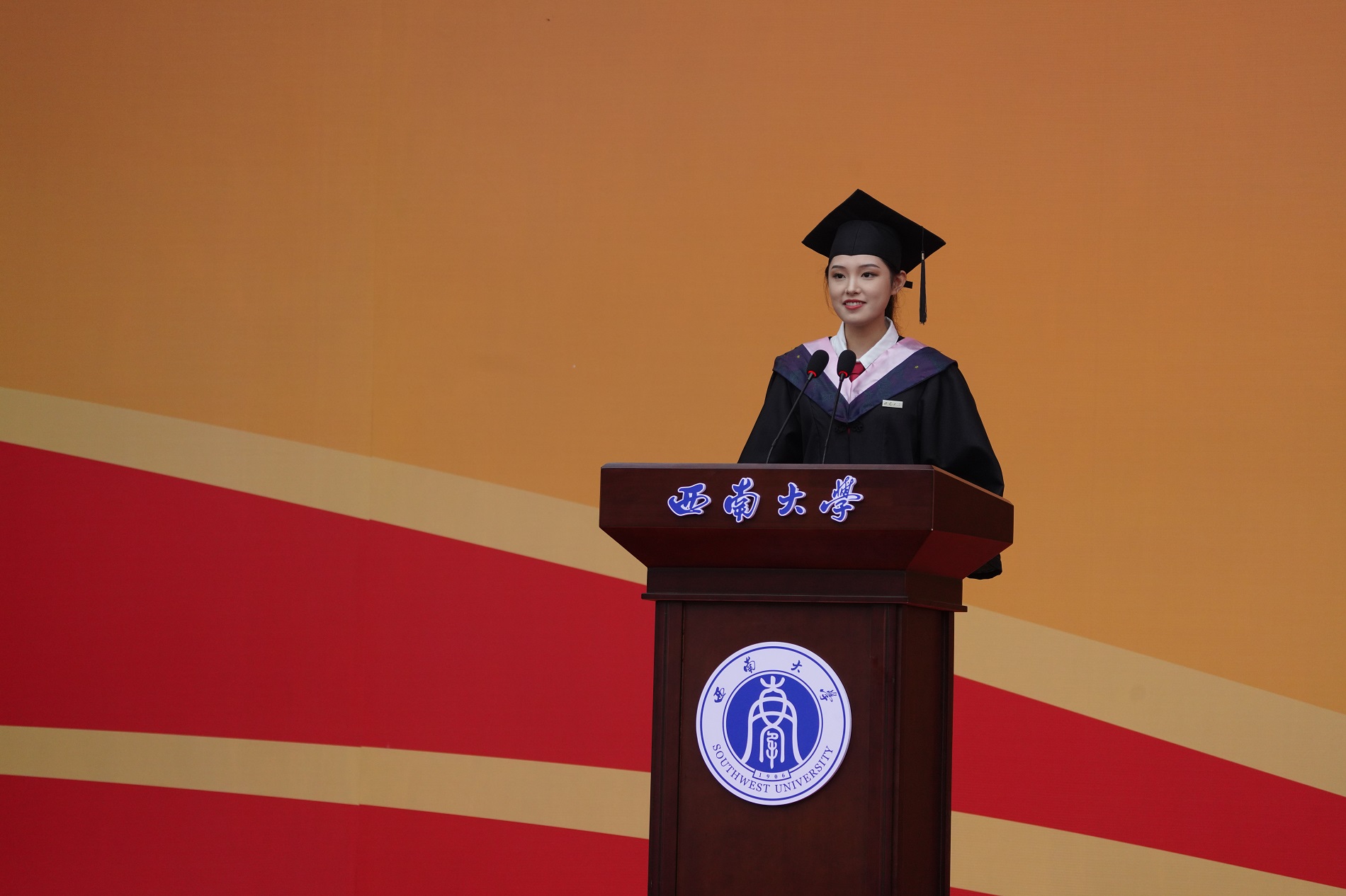毕业生代表、地理科学学院范天兰分享了自己在西大的温暖成长经历。她向母校、老师和同学真诚致谢,感谢他们为她“亮起灯盏”,帮助她“沐光而行,找到了梦想的信号”。她祝愿所有的同学,朝着梦想留下的信号,一路前行,风雨灿烂,与祖国同行,与时代共振,在奉献中焕发青春光彩。