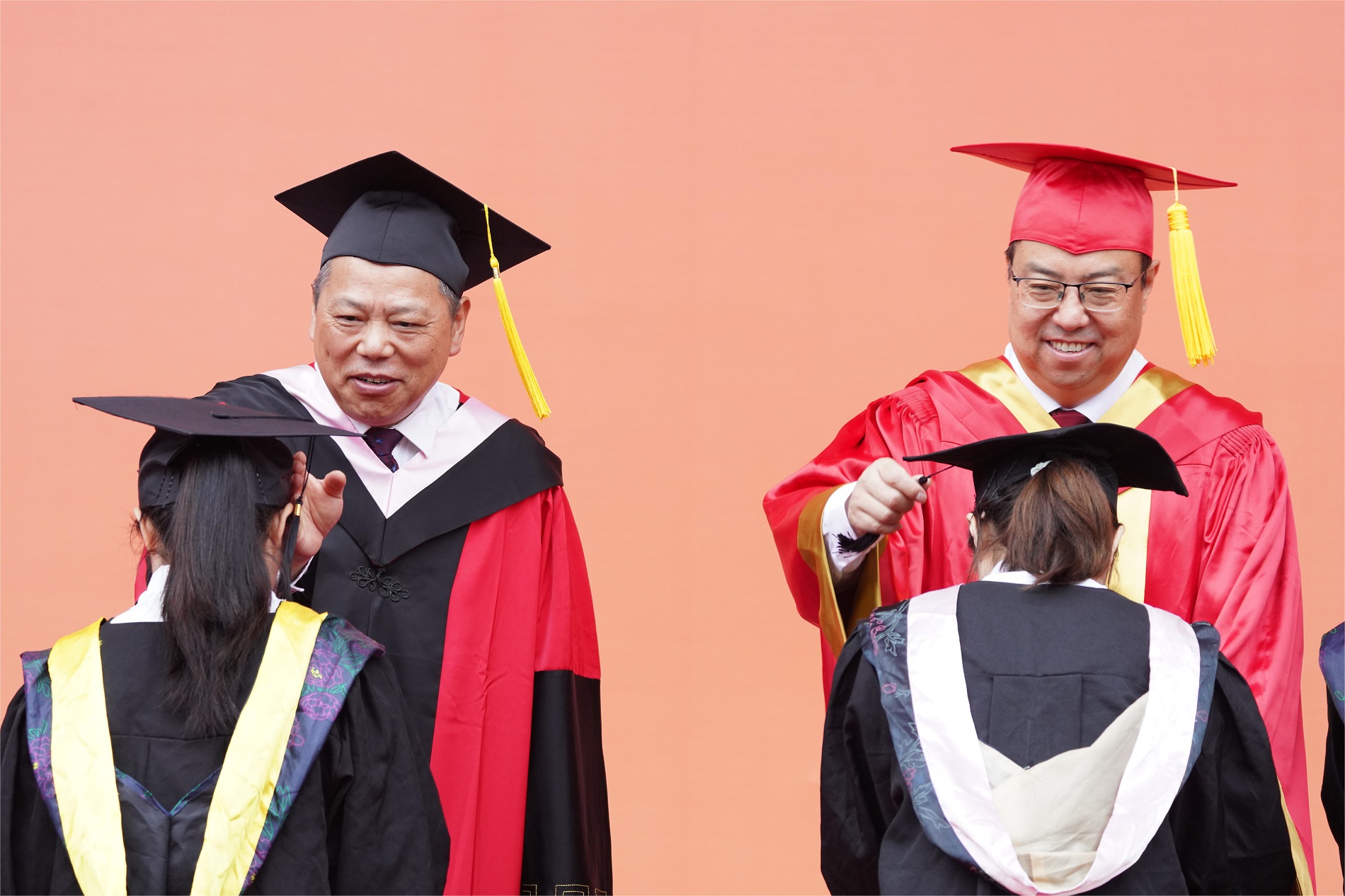 在激昂奋进的音乐声中,主席台领导、校学位评定委员会委员为获表彰的毕业生代表颁发荣誉证书,为毕业生代表颁发毕业证书并为学位获得者代表授位。