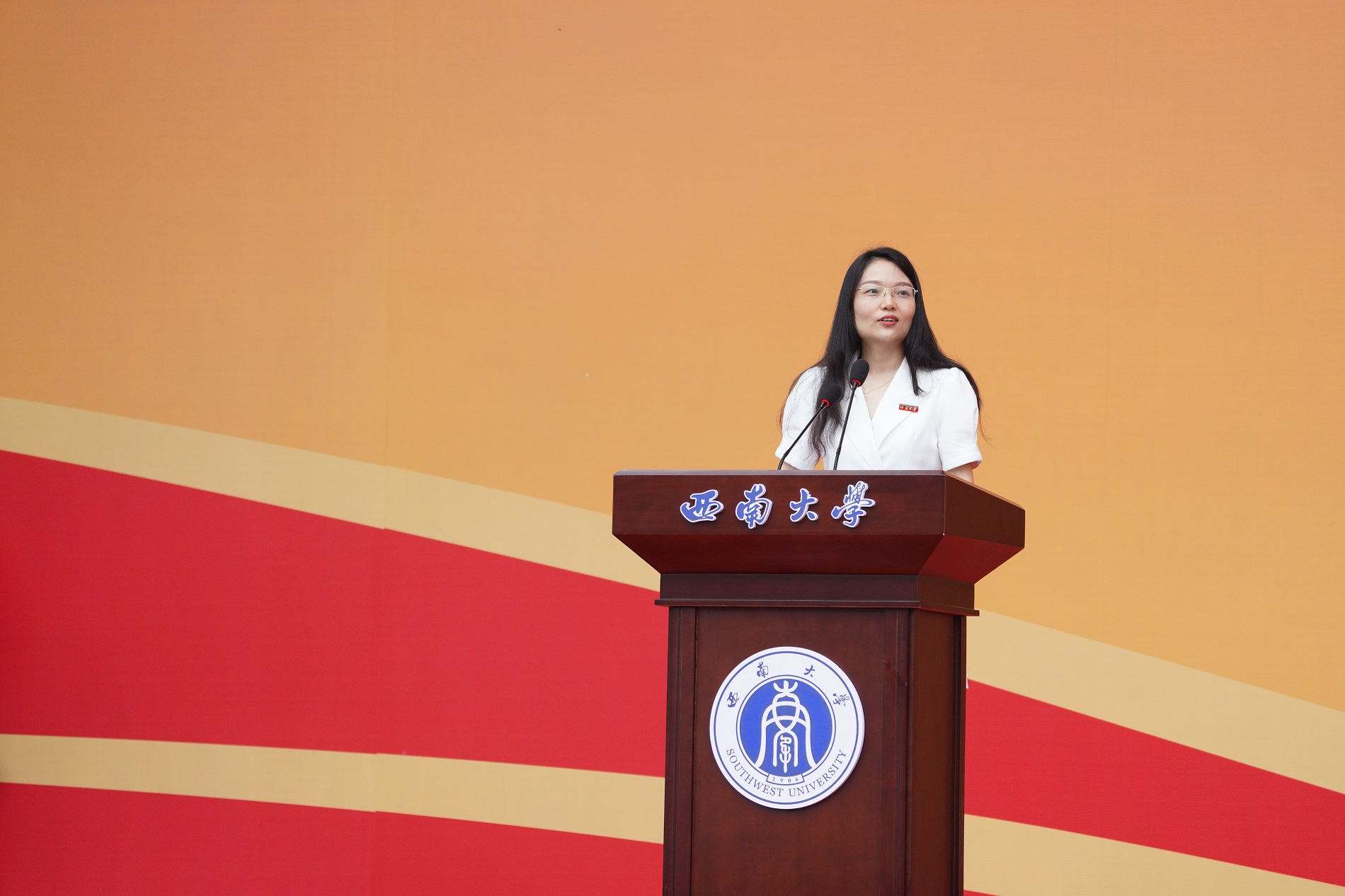 毕业典礼上,校史宣讲团成员周灵为大家带来一堂“毕业前的校史课”,她以“青春,在校史中成长”为题,带领大家穿越百年时光,以国家民族利益至上的动人故事,激励西大学子崇德尚善,创我荣光,让青春在校史中璀璨发亮。
