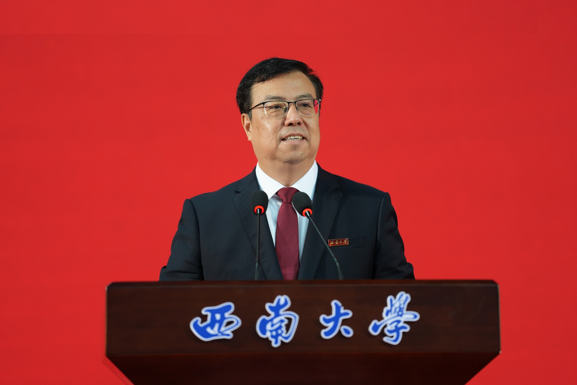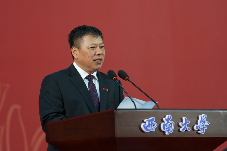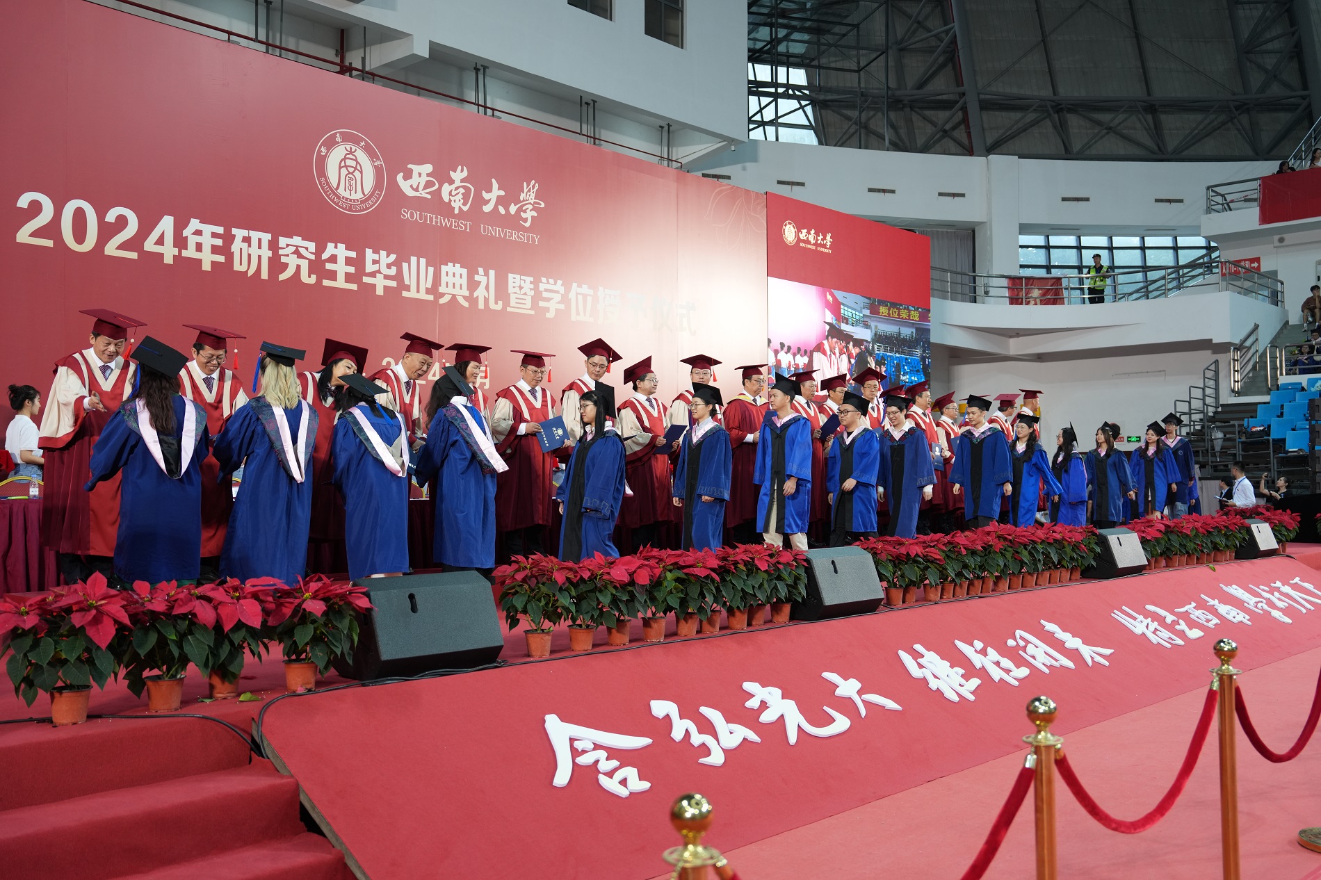 在庄严的国歌声中,典礼拉开序幕。党委书记张卫国宣读研究生毕业决定和表彰决定。根据学校学籍管理办法,经学校审核,研究决定:准予297名博士研究生、5339 名硕士研究生、15名来华留学博士研究生、45名来华留学硕士研究生毕业。根据重庆市和学校研究生有关表彰办法,经履行相关评审程序,确定97名研究生为“重庆市普通高校优秀毕业研究生”,733名研究生为“金年会jinnianhuicom2024年优秀毕业研究生”,12名来华留学研究生为“金年会jinnianhuicom2024年优秀来华留学毕业研究生”,209名研究生撰写的学位论文为2024年校级优秀学位论文。