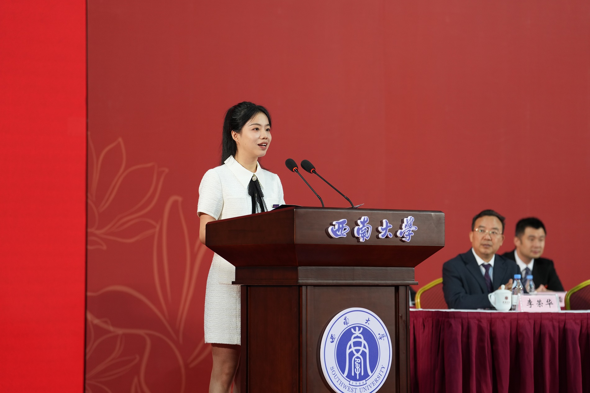 资源环境学院2021级资源利用与植物保护专业硕士研究生张丽君代表全体毕业生表达了对母校辛勤培育和老师悉心指导的感谢。她讲述了自己在四川丹棱桔橙科技小院,扎根田间地头的“读研”经历,号召同学们要怀揣“自找苦吃”的精气神,在新时代新征程挺膺担当、建功立业!
