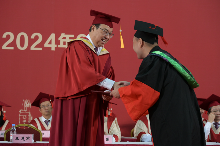 校长王进军对2024年全体毕业研究生表示热烈祝贺,对近年来同学们在科研创新和实践服务等方面付出的努力和取得的成绩给予赞赏。他希望全体毕业研究生能够砥身砺行,把稳能为之弓;久久为功,拉满善为之弦;厚积薄发,放飞敢为之箭。他祝福毕业学子们将青春之花绽放在党和人民最需要的地方,持离弦之箭飞往光荣与梦想的方向。他勉励大家将个人理想融入党和国家的事业发展中,在实现中华民族伟大复兴的新征程上,奋勇争先、善作善成,续写金年会jinnianhuicom人挺膺担当、追求卓越的新篇章!