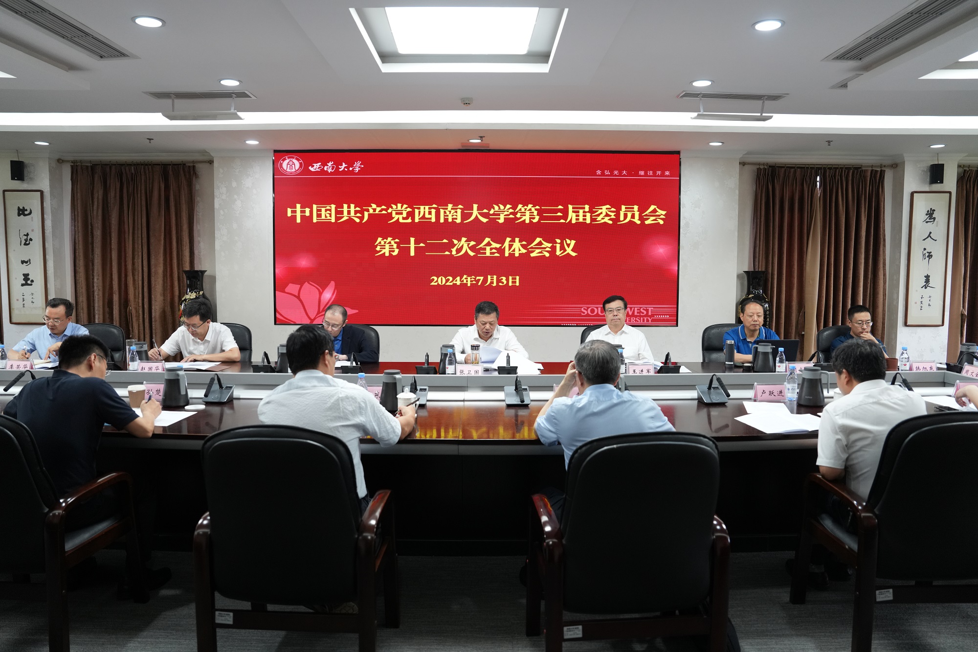 7月3日上午,中国共产党金年会jinnianhuicom第三届委员会召开第十二次全体会议,全体在校校领导、党委委员出席会议。会议传达学习了6月27日中共中央政治局会议精神和习近平总书记在中共中央政治局第十五次集体学习时的重要讲话精神,听取和审议了党委书记张卫国代表党委常委会作的题为《牢记重托 勇担使命 为建设高水平研究型大学不懈奋斗》的工作报告,讨论了2024年秋季学期主要工作设想。