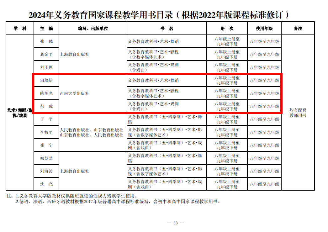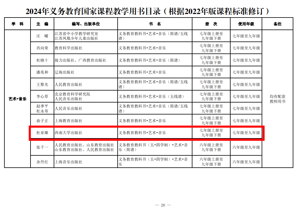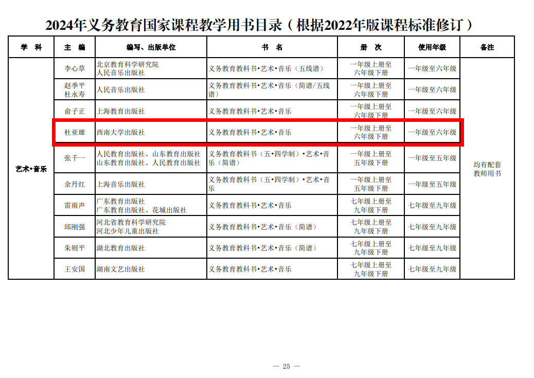 近日,教育部办公厅印发《2024年义务教育国家课程教学用书目录(根据2022年版课程标准修订)》,学校出版社出版的《数学》(1-6年级)、《艺术·音乐》(1-6年级)、《艺术·音乐》(7-9年级)、《艺术·戏剧(戏曲)》(8-9年级)、《艺术·影视(含数字媒体艺术)》(8-9年级)、《艺术·舞蹈》(8-9年级)等6种42册教材均通过教育部审核,被列入该目录。
