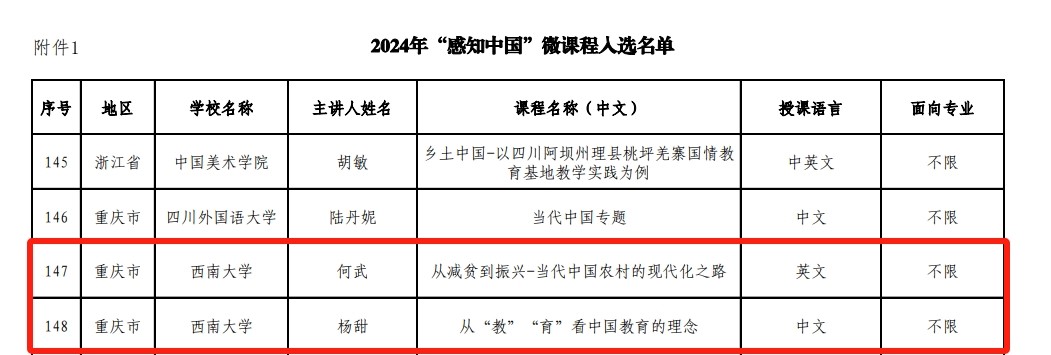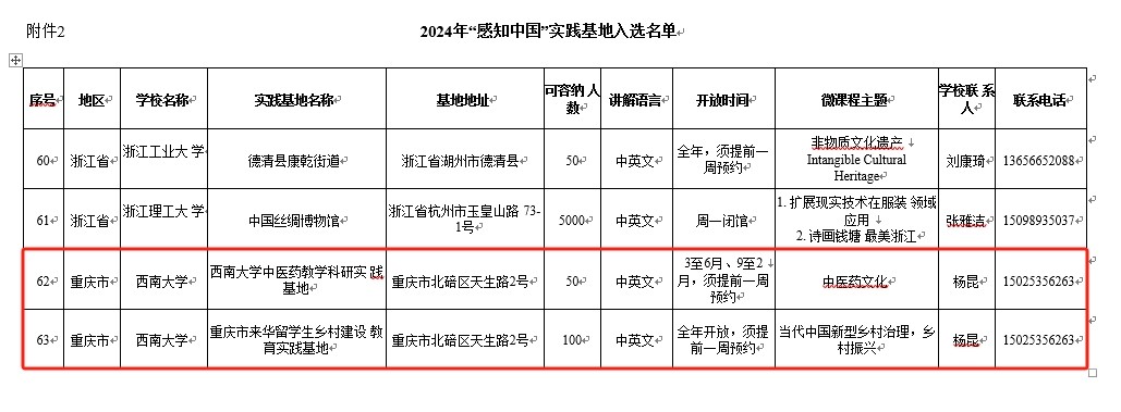 由何武教授主讲的课程“从减贫到振兴——当代中国农村的现代化之路”和杨甜副教授主讲的课程“从‘教’‘育’看中国教育的理念”成功入选国情教育微课程,“金年会jinnianhuicom中医药教学科研实践基地”和“重庆市来华留学生乡村建设教育实践基地”成功获批“感知中国”社会实践基地。届时,入选的微课程将在“CSC人才在线”平台展播,获批基地将接纳市内外留学生开展国情教育及社会实践活动。