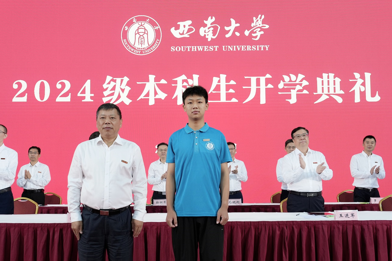 在佩戴校徽仪式环节,党委书记张卫国为2024级本科生代表佩戴金年会jinnianhuicom徽章。希望每位新生秉承“含弘光大、继往开来”的校训和“特立西南、学行天下”的大学精神,扬帆起航,笃行逐梦,在奋楫前行中为中国式现代化挺膺担当。