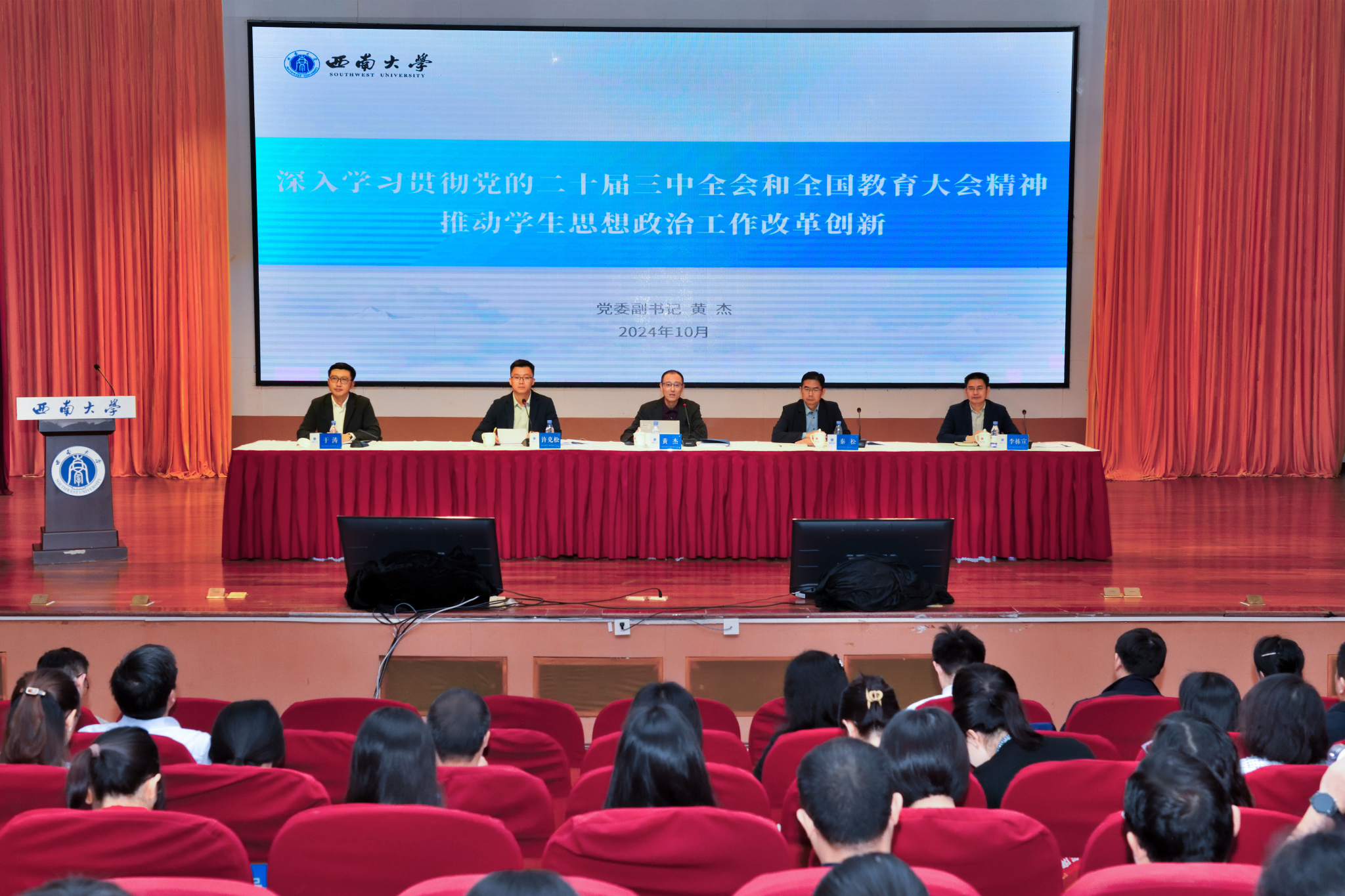 黄杰作了题为“深入学习贯彻党的二十届三中全会和全国教育大会精神,推动学生思政工作改革创新”的主题报告,从三个方面提出具体要求。一是突出“三个导向”,把准学生思政工作改革新方位。突出目标导向,始终坚持为中国式现代化服务;突出价值导向,牢固树立以学生为中心的理念;突出问题导向,系统破解制约发展的卡点堵点。二是对标“三个重点”,把准学生思政工作改革新要求。就如何对标落实新时代立德树人工程、全面推进教育评价综合改革、统筹高质量发展和高水平安全三项重点任务做了部署安排。三是推进“五能融合”,构建学生思政工作发展新生态。立足新时代高校思政工作体系构建,围绕“现代治理效能、队伍成长动能、学生发展潜能、社区育人功能、数字平台智能”五个方面,构建具有西大辨识度的高能级育人新生态,形成强大思政引领力,助力时代新人培育。