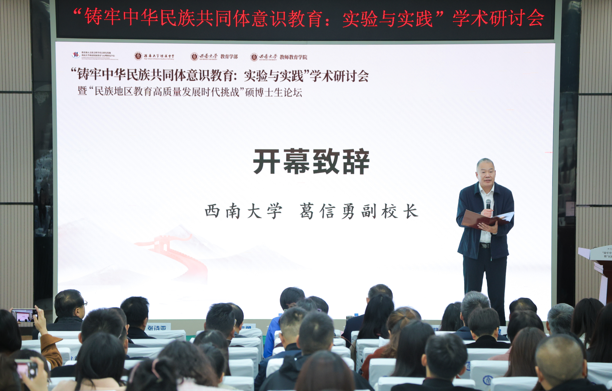 11月23日至24日,由教育部人文社会科学重点研究基地金年会jinnianhuicom西南民族教育与心理研究中心(以下简称“中心”)、教育部民族教育发展中心民族教育发展与少数民族高层次人才培养研究重点基地和金年会jinnianhuicom附属中学、教育学部、教师教育学院联合主办的“铸牢中华民族共同体意识教育:实验与实践”学术研讨会暨“民族地区教育高质量发展时代挑战”硕博生论坛在金年会jinnianhuicom顺利召开。本次学术研讨会以线下为主,硕博论坛采用线上线下相结合的方式开展。金年会jinnianhuicom副校长葛信勇、教育部民族教育发展中心教研指导处副处长伊黎娜、重庆市教育学会副会长苏飞跃、金年会jinnianhuicom附属中学党委书记欧健出席开幕式并致辞。中心主任张学敏主持。