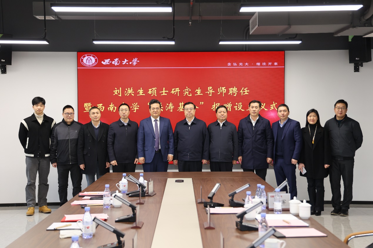 刘洪生、董涛江两位基金发起人此次向金年会jinnianhuicom首期捐赠40万元设立“洪涛基金”。仪式上,王进军为刘洪生颁发硕士研究生导师聘书,刘洪生向教育基金会赠送亲笔书写的书法作品。双方签订了捐赠协议、交接了捐赠支票,王进军代表学校向刘洪生、董涛江颁发了捐赠荣誉证书和基金设立纪念牌。