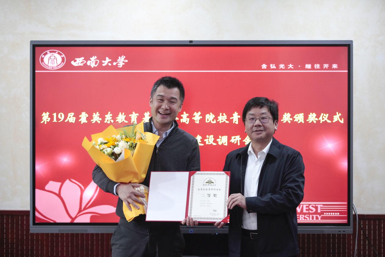 邹芙都为罗雷颁发了“第19届霍英东教育基金会高等院校青年科学奖二等奖”荣誉证书,并向其表示祝贺。据悉,霍英东教育基金会设立于1986年,长期致力于资助和奖励在科学研究和教育教学中做出优异成绩的高校教师。基金会奖励项目历经多次改革,目前已成功评选19届,惠及全国300余所高校、4000余名教师。截至目前,学校有27位教师获此殊荣。