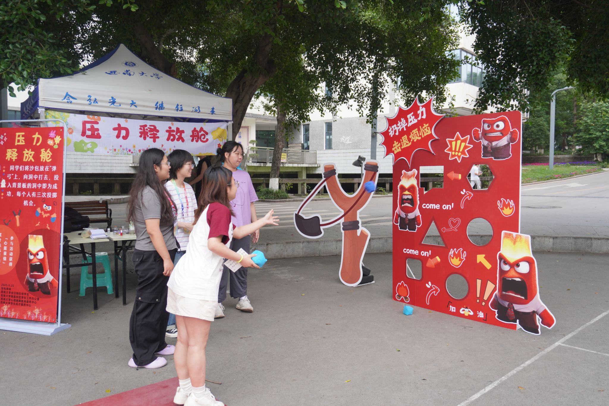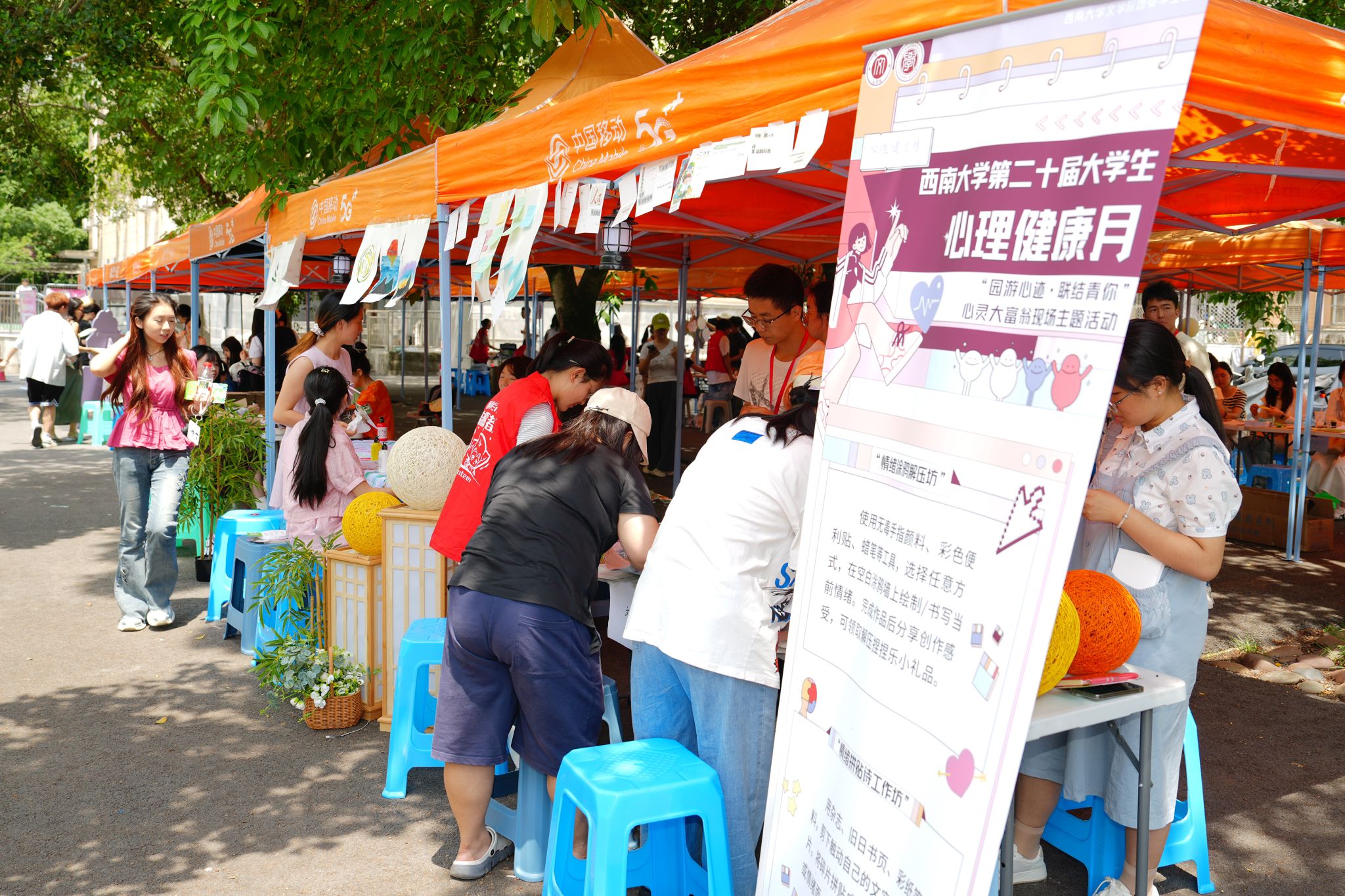 作为活动亮点,“5・25” 心理健康日现场主题活动在校园各园区火热开展。同学们化身“心灵旅行者”,手持《旅行日志》中的指示,在五个园区驿站完成“心灵任务”,收集“心灵金币”,解锁成长密码,变身“心灵大富翁”,在沉浸式体验中探索自我、释放压力。各学院(部)纷纷推出创意心理微活动,从传统手工艺制作中的正念培养,到情绪管理模拟,再到团队协作闯关挑战,巧妙融合传统文化与现代心理教育理念。同学们通过趣味互动与创意设计,在互动实践中深化了对心理健康的认知,提升了心理调适水平。