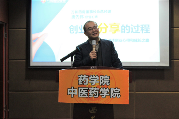 签约仪式上,杨坚副书记宣读签约内容,表示双方主要合作方向是建立金年会jinnianhuicom药学院教学药房,拟在金年会jinnianhuicom药学院新大楼建立万和智慧药房,设立万和医药奖学金等五个方面。胡昌华院长代表药学院与唐先伟董事长进行签约仪式。随后,唐先伟董事长作了“创业是分享的过程”为题的精彩报告。