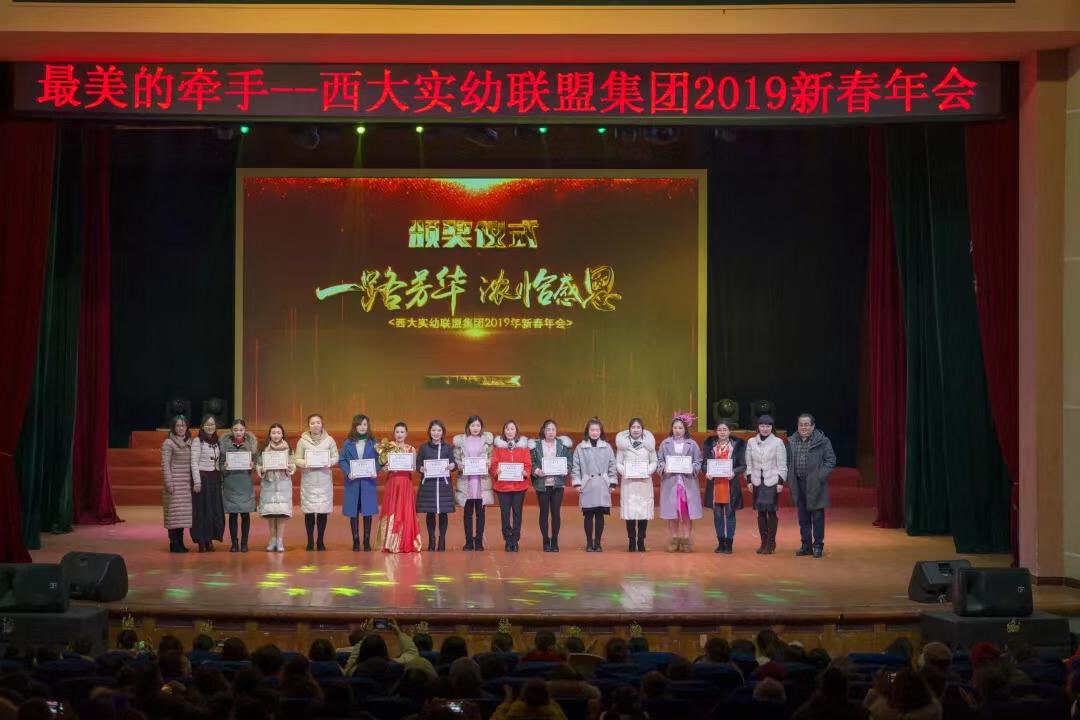 年会由金年会jinnianhuicom实验幼儿园统筹策划,各姊妹园广泛参与,精心准备。节目热闹、喜庆、温馨,精彩纷呈,舞蹈、哑剧、快板等形式多样的节目无不展现幼师风采,体现了集团和谐向上的美好形象。同时,年会还颁发了西大实幼联盟集团首届先进个人和优秀成果荣誉证书。
