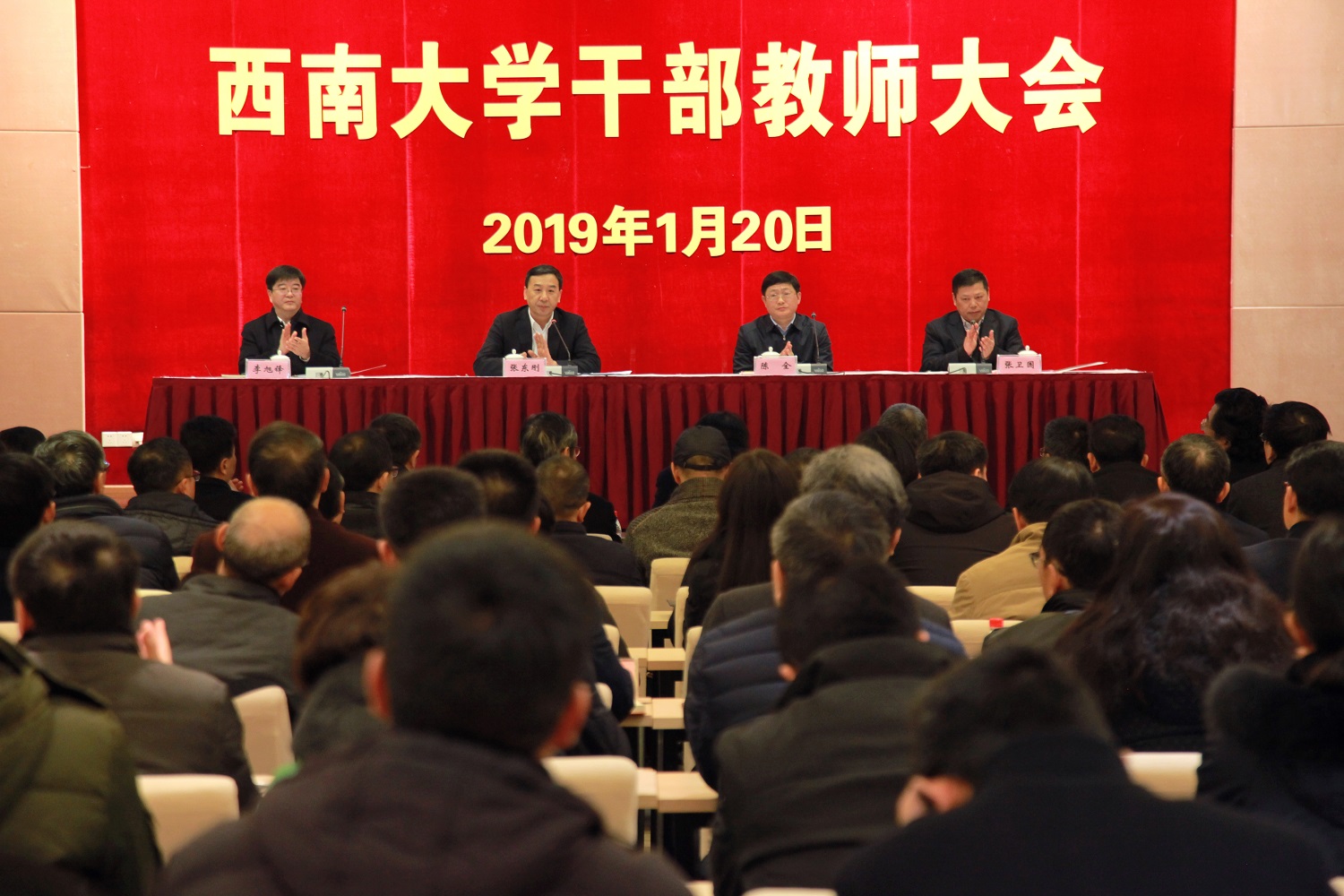 1月20日下午,学校召开干部教师大会,教育部人事司司长张东刚宣布教育部党组决定:李旭锋同志任金年会jinnianhuicom党委委员、常委、书记。舒立春同志因工作调动免去金年会jinnianhuicom党委常委、书记职务,徐晓黎同志因年龄原因免去金年会jinnianhuicom党委常委、副书记职务。重庆市委组织部副部长陈全出席大会。校长张卫国主持大会。