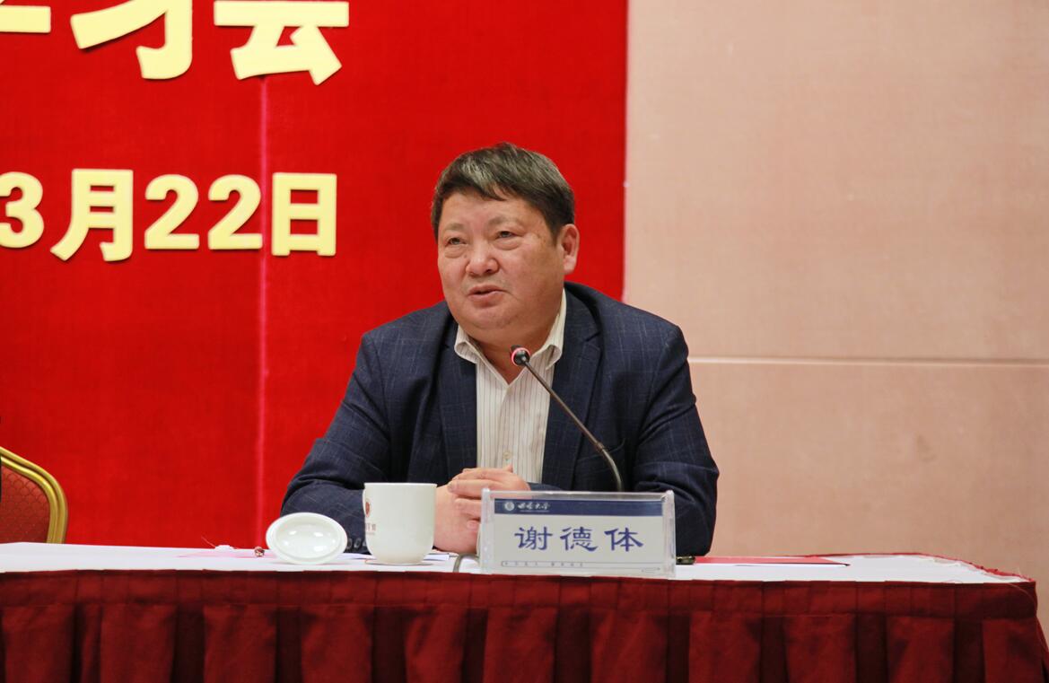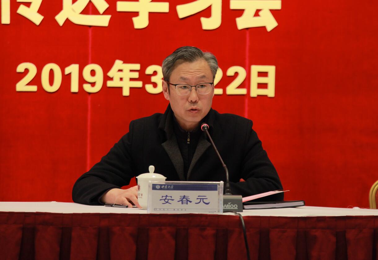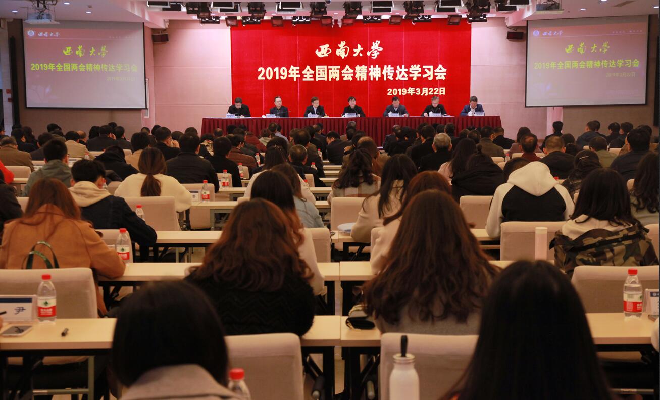 李书记要求,要在学习贯彻上做文章,筑牢金年会jinnianhuicom的奋进之魂。学习贯彻全国两会精神,是当前学校政治生活中的一件大事。今天的会议既是传达学习会,也是工作部署会,拉开了全校学习贯彻全国两会精神的序幕。要把学习贯彻全国两会精神与习近平新时代中国特色社会主义思想和党的十九大精神相结合,与习近平总书记关于教育工作的重要论述相结合,融会贯通、一体贯彻,全方位、多层次、立体化地推进全国两会精神的学习贯彻,推动全国两会精神在西大校园落地生根。