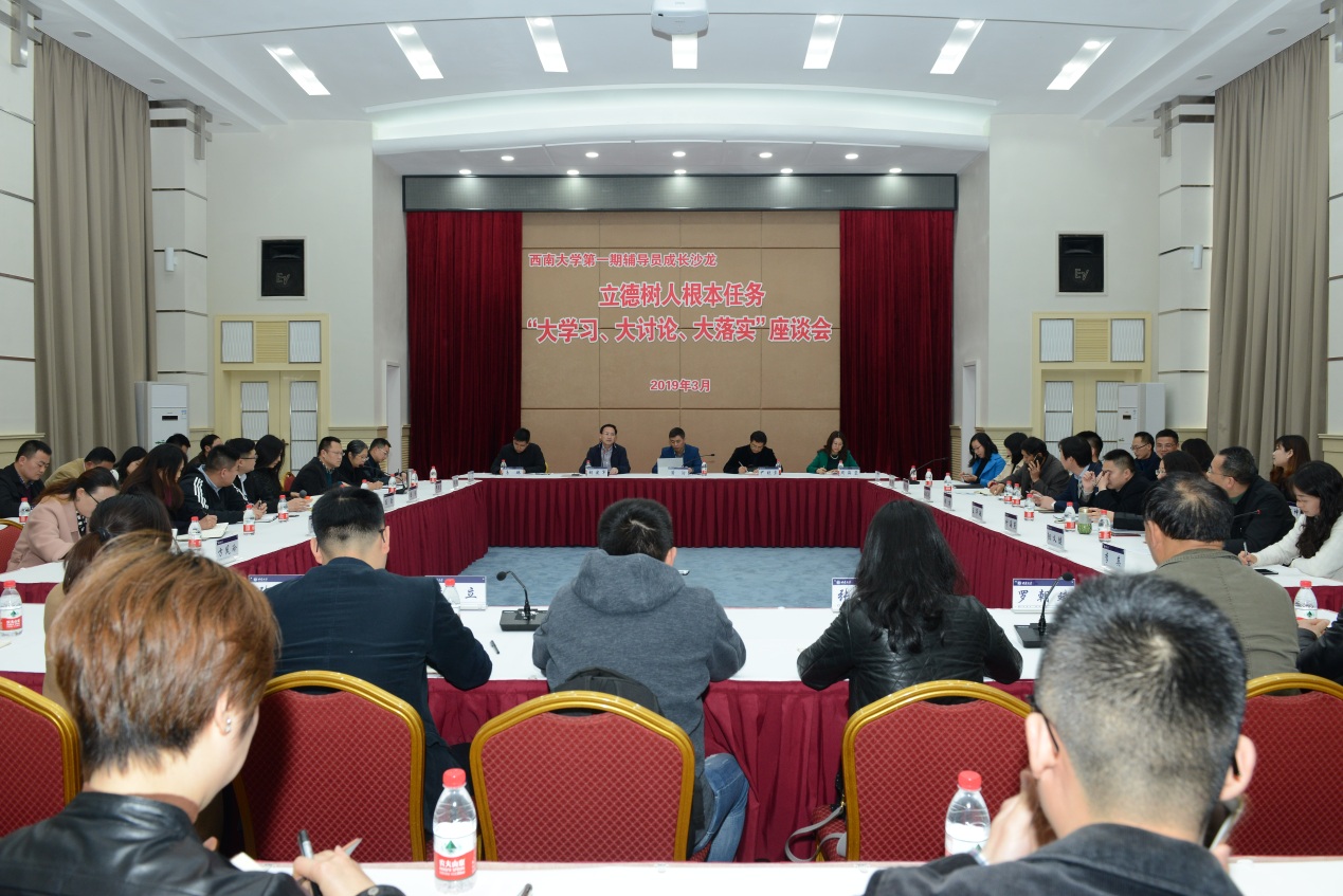 3月27日下午,学校第一期辅导员成长沙龙暨立德树人根本任务“大学习、大讨论、大落实”座谈会在桂园宾馆金桂厅举行,党委副书记潘洵出席会议。教务处、党委研究生工作部、党委学生工作部、创新创业学院等职能部门领导、各二级学院(部)全体党委副书记、辅导员代表参加座谈。