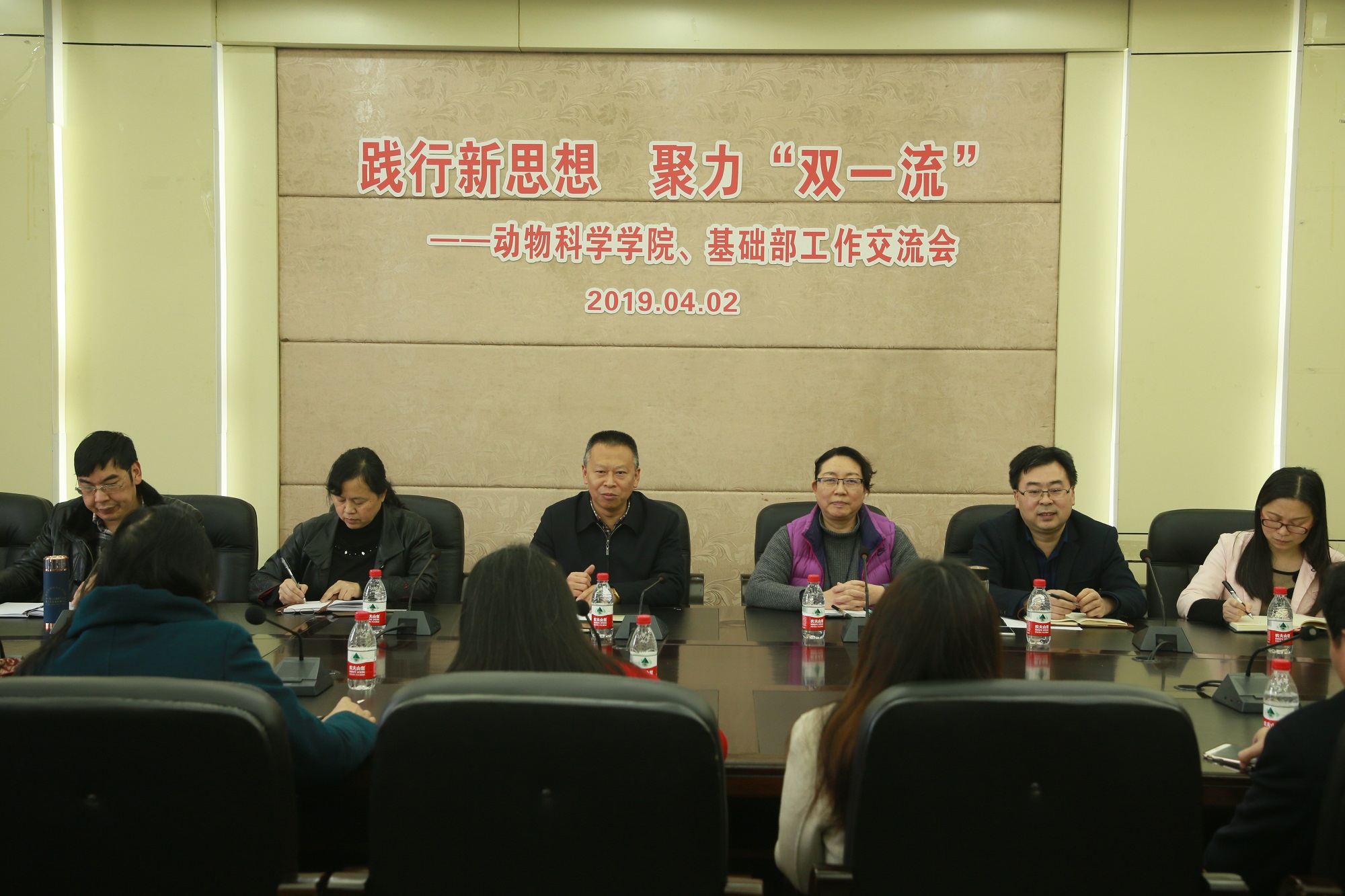 朱汉春书记就抓党建、带班子、促改革、强服务、推进“双一流”建设提供坚强保障方面作了发言。朱书记指出,要引导广大青年坚定听党话跟党走,进一步强化“全党抓思想政治引领”的工作理念,用习近平总书记新时代中国特色社会主义思想武装头脑,指导实践,推动工作。基础部党总支书记童学兰指出,要以思想政治引领为首要任务,把思想政治引领贯穿党的各项工作全过程,不断增进对党的信念、信心,高扬“不忘初心紧跟党走”的主旋律。动物科学学院刘娟院长、基础部魏东主任分别介绍了本单位基本情况,与会人员围绕人才培养、课程思政建设实施、学科队伍建设、科学研究等进行了深入交流,达成共识。
