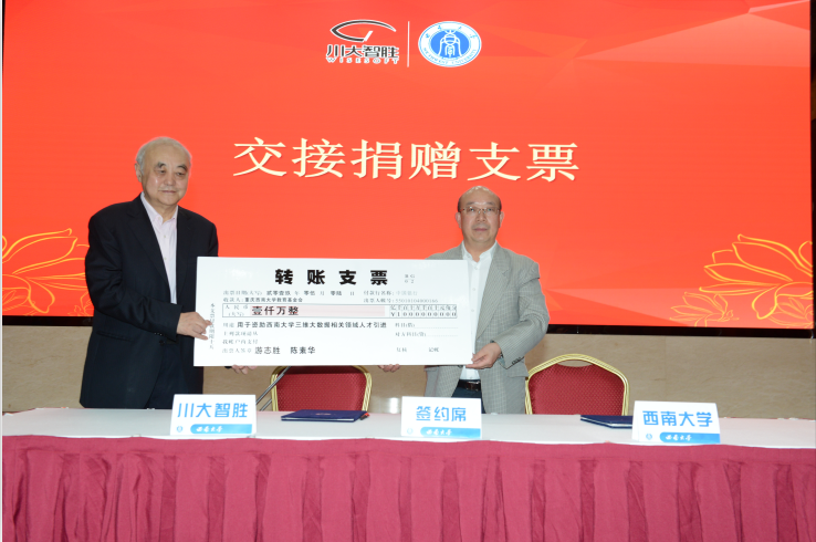 在仪式上,游志胜先生与其夫人陈素华女士以个人名义向金年会jinnianhuicom捐赠1000万元人民币,用于资助学校三维大数据相关领域的人才引进。这将助力学校相关领域的科研工作迈上更高的台阶。陈素华女士是原西南师范学院数学系65级校友,这份捐赠也表达了她对母校的感恩之情。