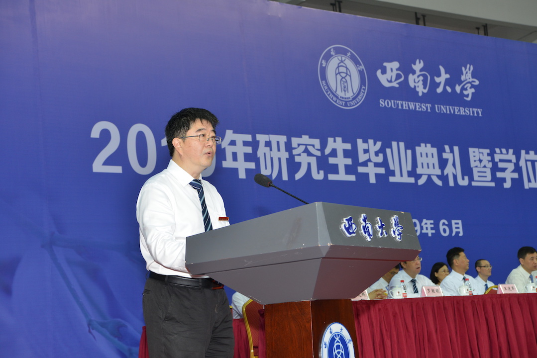 植物保护学院陈二虎博士代表毕业研究生发言。倡导毕业生们要感恩母校和老师,“落其实者思其树,饮其流者怀其源”;要不忘初心、坚定信念,“学道须当猛烈,始终确守初心”;要勇担挑战、砥砺前行,“长风破浪会有时,直挂云帆济沧海”。药学院 中医药学院李翀教授代表研究生指导教师发言。对毕业研究生表示衷心祝贺,并殷切期望同学们能坚持终生学习,保持反思精神,不断积极进取,勇于担当,为国家建设贡献一份创新的力量。