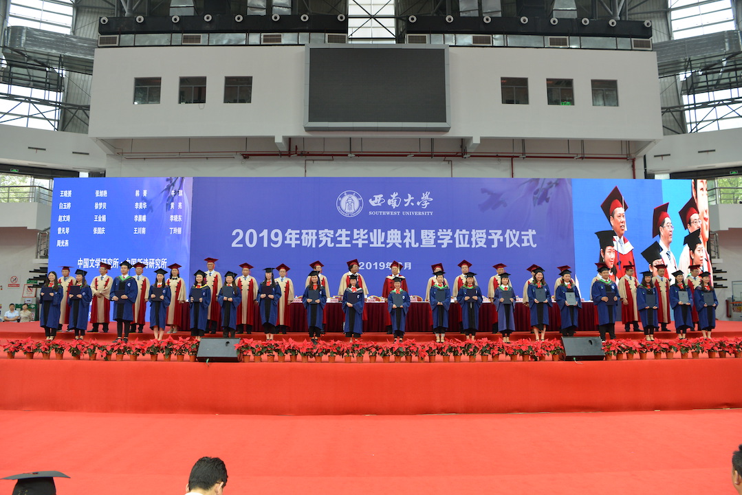 第一阶段,首先举行研究生毕业典礼。校领导、党委常委、校长助理,学校学生工作领导小组成员出席毕业典礼,典礼由学校党委副书记潘洵主持。毕业典礼在雄壮的国歌声中拉开帷幕,学校学位评定委员会副主席、党委书记李旭锋宣读了金年会jinnianhuicom2019年研究生毕业决定和有关表彰决定;毕业生代表依次上台领取毕业证书;重庆市及金年会jinnianhuicom优秀毕业研究生代表、基层就业优秀毕业研究生代表、优秀学位论文获得者代表分别上台接受表彰。