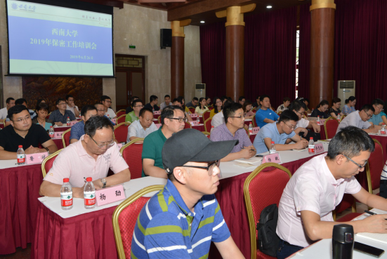 6月26日下午,学校2019年保密工作培训会议在东方红会议厅召开。重庆市国家保密局宣传法规处副处长刘进、四川大学国家保密学院讲师吕顺应邀分别作了题为《高校保密管理中应注意的问题》《高校保密行政管理》的专题讲座。学校保密委员会委员、各机关单位主要负责人、全体涉密人员等共计80余人参加会议。学校副校长、保密委员会副主任王进军主持会议。