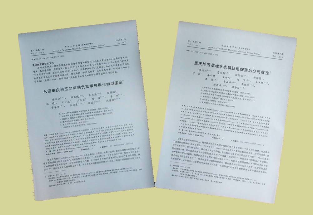 草地贪夜蛾是一种联合国粮农组织全球预警的重大洲际迁飞性农业害虫,自2019年1月从东南亚侵入我国云南、广西以来,已经向北迁飞蔓延了19个省市自治区,主要危害玉米、高粱等大宗粮食作物,危害巨大。该虫快速迁徙引起了国务院的重视,近期农业农村部专门召开了草地贪夜蛾的防控会议,国内许多科研院所也纷纷投入人财物对该害虫进行研究。自今年5月初草地贪夜蛾在重庆发现以来,学校家蚕基因组生物学国家重点实验室潘国庆研究员课题组迅速行动,在重庆市各级农业部门的大力配合下,第一时间从各区县收集虫样,快速开展了草地贪夜蛾生物型和肠道菌群的研究,希望能为我国草地贪夜蛾的综合防控提供第一手的详实数据。《金年会jinnianhuicom学报(自科版)》关注学术热点研究,积极服务于学校重点科学研究,与该课题组紧密合作,及时调整出刊计划,组织精干编辑认真、高效完成了稿件的评审、编辑工作,仅仅用一周时间,课题组两篇关于草地贪夜蛾的最新研究成果《入侵重庆地区的草地贪夜蛾种群生物型鉴定》、《重庆地区草地贪夜蛾肠道细菌的分离鉴定》通过该学报于7月4日在中国知网优先发表,及时发布了国家急需的草地贪夜蛾相关研究报告,为治理草地贪夜蛾提供了基础数据。